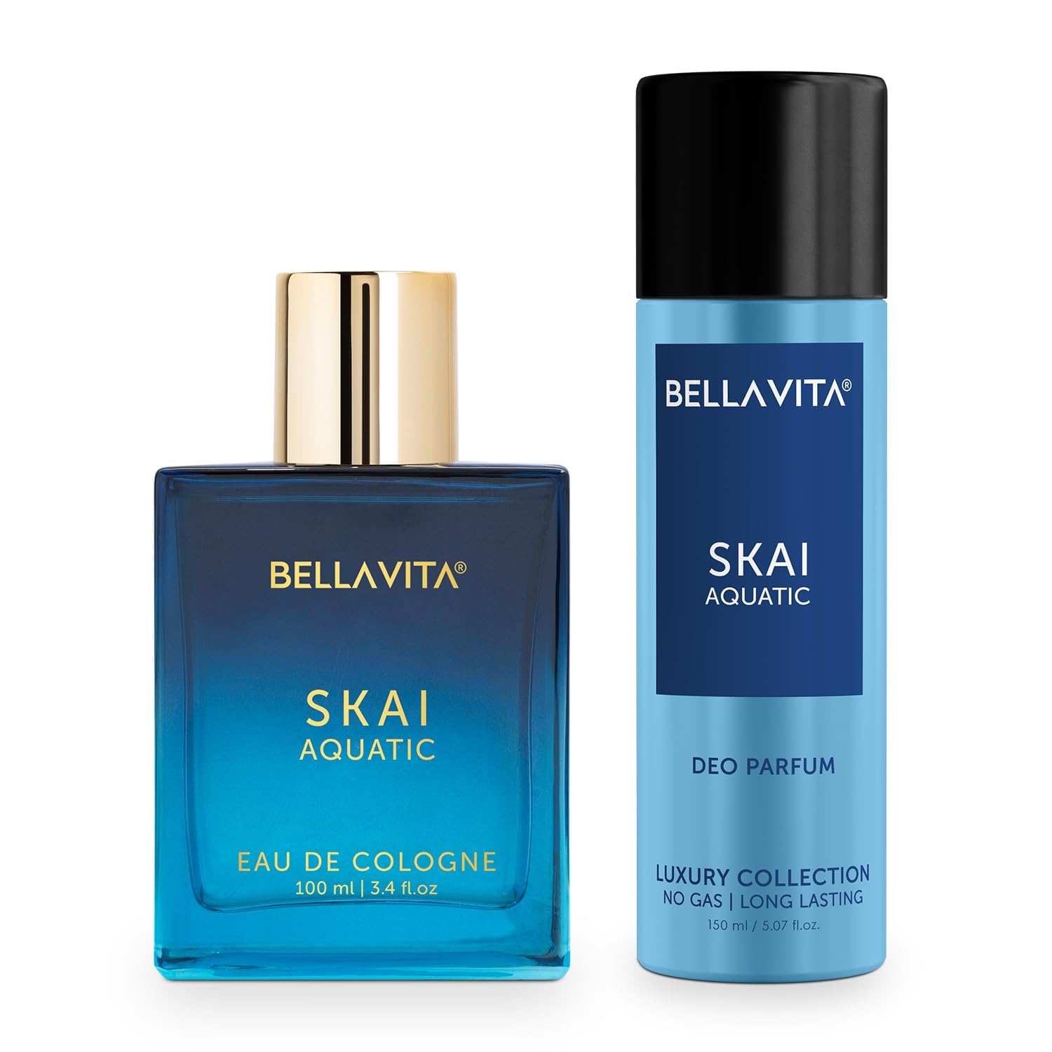 Bella Vita Luxury SKAI AQUATIC No Gas Deodorant Body Parfum for Men with Bergamot Pineapple Lavender | Aquatic & Fresh Fragrance Musky & Premium & Long Lasting Body Perfume DEO 150 MLReach for the sky and be limitless with SKAI Aquatic Deo Parfum. Top notes of citrus bergamot coriander mandarin and pineapple give you an instant burst of energy while heart notes of clary sage lavender and pink pepper keep you cool and collected as you take on the day. Patchouli at the base keeps you grounded and adds confidence as you reach for the stars.Bella Vita Luxury Skai Aquatic Eau De Cologne Unisex Perfume for Men & Women with Bergamot Pink Pepper |Long Lasting Aqua EDC Fragrance Scent 100 MlExudes Freshness and Sophistication. An iconic blend of bergamot and coriander at the top fuses perfectly with the invaluable at its base and pink pepper at its heart. The Skai Aquatic Eau De Cologne has a fresh appeal for those who are effortlessly sophisticated yet understatedly charming