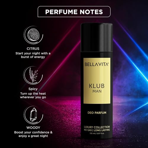 Bella Vita Luxury KLUB Man No Gas Body Deodorant Parfum for Men with Lemon Rose and Vanilla|Musky and Spicy Long Lasting Body Perfume DEO 150 MlBe the life of the party with K.L.U.B Man Deo Parfum a fragrance that inspires you to party to the fullest. Wear it to smell great through the night as you dance into the wee hours of the morning. Top notes of lemon pineapple blackcurrant and apple pack a refreshing punch while heart notes of birch jasmine and rose add freshness. Base notes of musk vanilla and patchouli make this spicy long-lasting fragrance your companion for a great time all the time.Bella Vita Luxury KLUB Man Eau De Parfum Perfume for Men with Lemon Rose and Vanilla|Musky and Spicy Long Lasting Premium EDP Fragrance Scent 100MlBella vita luxury klub man men edp eau de parfum perfume premium best affordable luxurious long lasting scent fragrance attar every day daily party office evening wear musky woody spicy oriental fresh