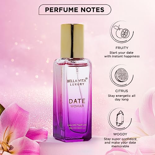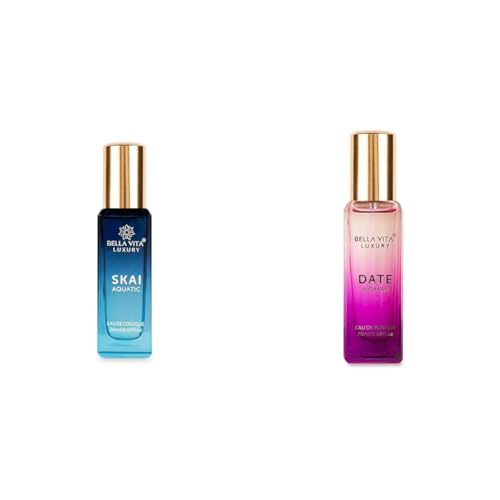 Bella Vita Luxury Skai Aquatic Eau De Cologne Unisex Perfume for Men & Women with Bergamot Pink Pepper |Long Lasting Aqua EDC Fragrance Scent 20 MlExudes Freshness and Sophistication. An iconic blend of bergamot and coriander at the top fuses perfectly with the invaluable Bergamot at its base and pink pepper at its heart. The Skai Aquatic Eau De Cologne has a fresh appeal for those who are effortlessly sophisticated yet understatedly charming!Bella Vita Luxury Date Eau De Parfum Perfume for Women with Pink Pepper Red Fruit & Jasmine |Fruity & Spicy Long Lasting EDP Frgarance Scent 20mlDATE Woman by Bella Vita Luxury is a celebration of love and romance. The perfume has top notes of Pink Pepper and Red Fruits. At its heart lies the trio of Jasmine Orange Blossom and Violet perfect for a romantic date. The base notes are Moss Musk and Powdery balanced by the sweetness of Vanilla to create an unforgettable moment.