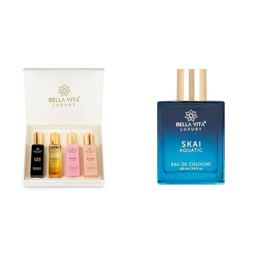 Bella Vita Luxury Woman Eau De Parfum Gift Set 4x20 ML for Women with CEO Honey Oud GlamRose Perfume|FloralFruity Long Lasting EDP Fragrance ScentUnbox a treasure of little luxuries with our Women's Luxury Perfume Gift Set that makes for the perfect gift for everyone. An arsenal of indulgence this box set carries some of Bella Vita Luxury's most iconic fragrances. A little bit about the fragrances in the Bella Vita Luxury Womens Perfume Gift Set: Rosè Woman EDP - The Rose Woman Eau De Parfum is a decadent endeavour - changing the way you think about roses! The woody Rose evolves singularly in a floral field breathing contentment! The whiff of medieval England unfolds as pink pepper comes in contact with citrusy orange. CEO Woman EDP - With powerful accents of bergamot and patchouli the CEO Woman is timeless! Its aqueous notes transpire fluidly to new horizons as hint of tonka and vanilla makes it irresistible! Glam Woman EDP - The Glam Woman Eau De Parfum celebrates versatility! Powerful Jasmine brings out the feminine character; Classy and glamourous with fresh hints of citrusy orange and calming white honey! Honey Oud PARFUM - Honey Oud Parfum is a floral-fruity flavour symphony. The sweet melody of Honey at the top oud at its heart comfortingly shifts to a blanket base of vanilla. A sinful exploration revealing the sweeter facets of life!"Bella Vita Luxury Skai Aquatic Eau De Cologne Unisex Perfume for Men & Women with Bergamot Pink Pepper |Long Lasting Aqua EDC Fragrance Scent 100 MlExudes Freshness and Sophistication. An iconic blend of bergamot and coriander at the top fuses perfectly with the invaluable at its base and pink pepper at its heart. The Skai Aquatic Eau De Cologne has a fresh appeal for those who are effortlessly sophisticated yet understatedly charming