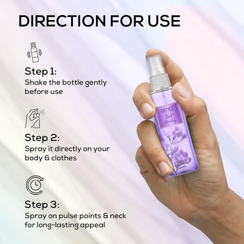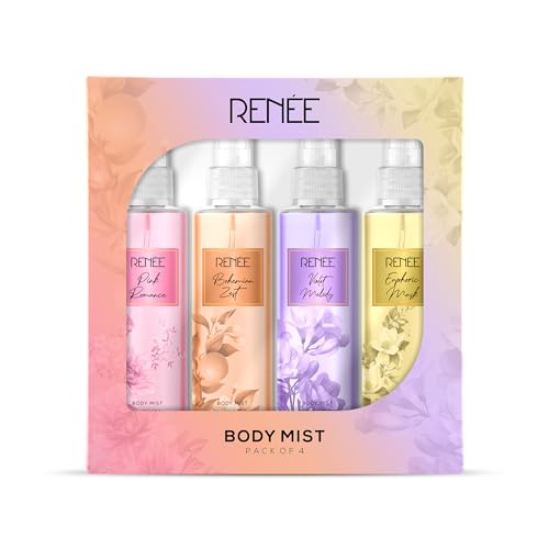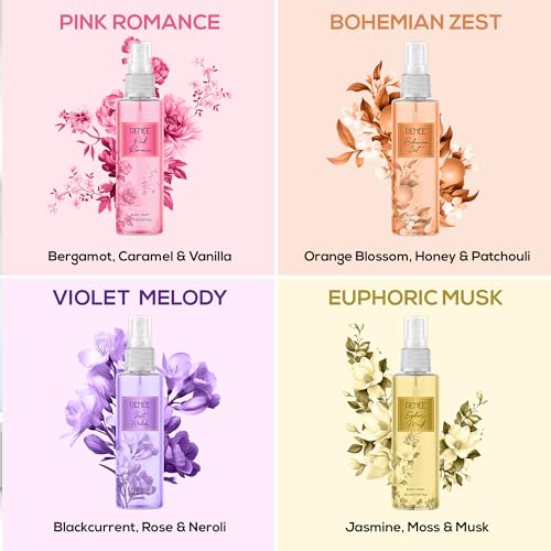 Pink Romance : Top Notes: Neroli Bergamot Red Fruits Rose Middle Notes: Raspberry Caramel Lily of the Valley Orchid Base Notes: Musk Vanilla Moss Get ready to tune into the floral melody of RENEE Pink Romance Body Mist. Crafted with heady notes of Bergamot Caramel and Vanilla; this long-lasting mist will leave you smelling like a bouquet of flowers drenched in a delicious dessert. Violet Melody : Top Notes: Sicilian bergamot Mandarin Blackcurrant liqueur. Middle Notes: Rose de mai Neroli Egyptain jasmine Freesia. Base Notes: Patchouli Woods Amber Orcanox Vanilla. Celebrate the party called life with RENEE Violet Melody Body Mist. Infused with the zesty notes of Blackcurrant Rose & Neroli; this concoction of bold and romantic fragrance will let you own the dance floor turn heads and leave a lasting impression. Euphoric Musk : Top Notes: Caraway Bitter Almond Middle Notes: Jasmine Sambac Moss Base Notes: Jacarander Wood Vanila Musk Wrap yourself into the zen-like aura of RENEE Euphoria Musk Body Mist. With each spritz you embark on a fragrant journey that transports you to a tranquil oasis where combined notes of Jasmine Moss & Musk serenade your senses. Bohemian Zest : Top Notes: Orange Blossom Middle Notes: Jasmine patchouli Base Notes: Cedarwood Rose Honey Indulge with the vibe of a free spirit with RENEE Bohemian Zest Body Mist. Created with an energizing play of Orange blossom Honey & Patchouli this mist is like dancing through a field of blooming flowers surrounded by the sweetest nectar!
