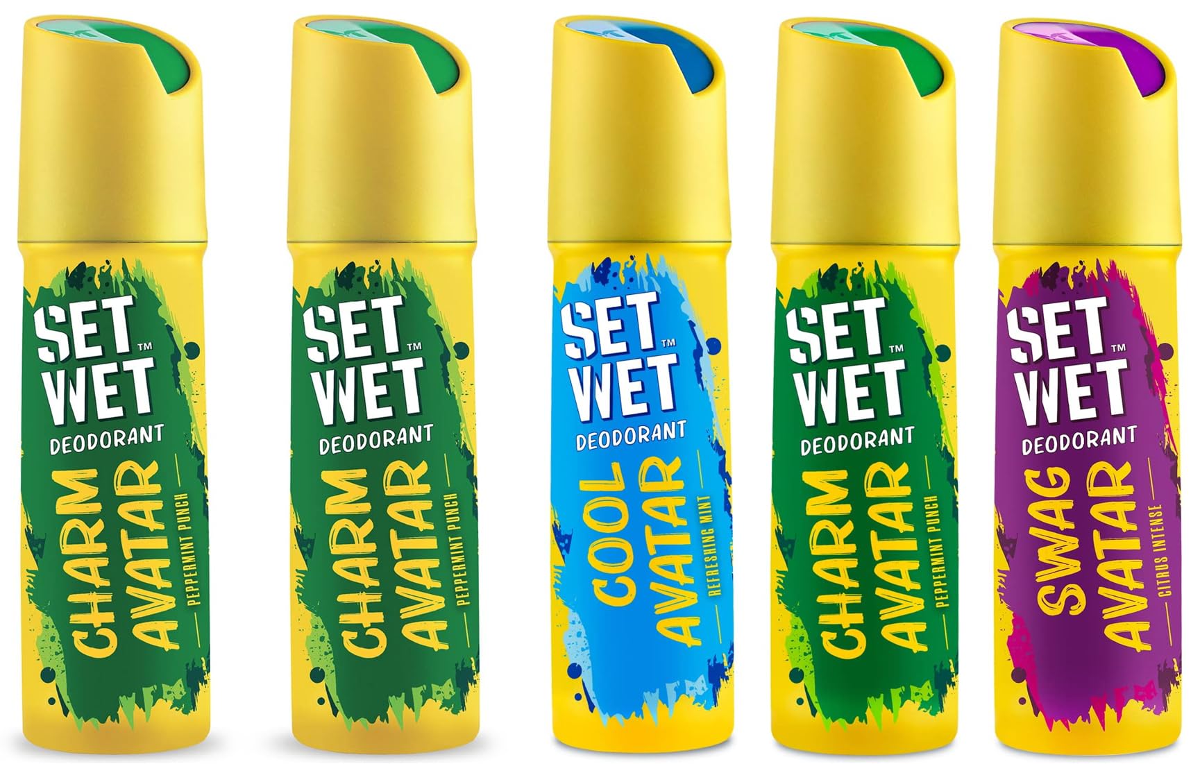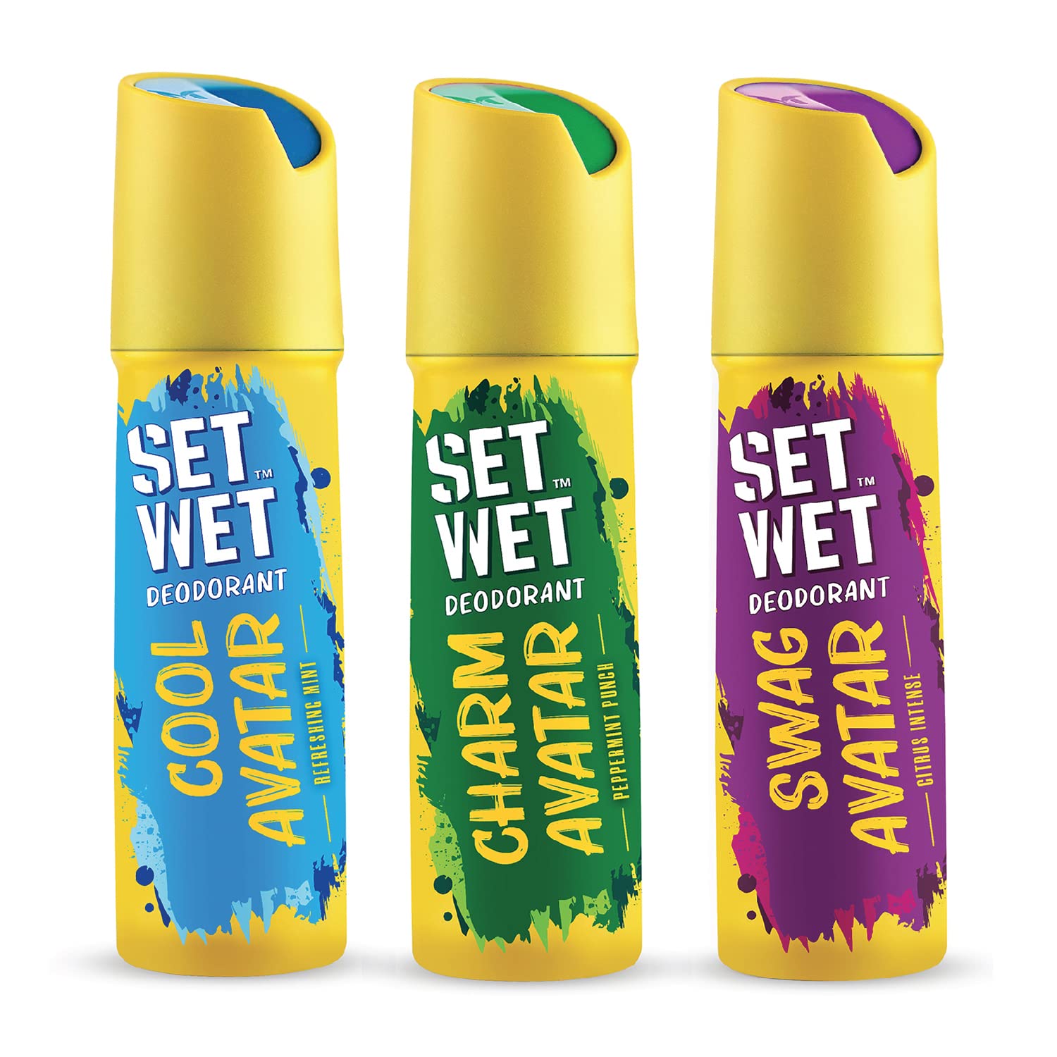 Set Wet Deodorant Spray Perfume for Men 150ml (Cool Charm and Swag Avatar Pack of 3)Set Wet Cool Avatar deodorant for men: Feel like the king of sun and sand with the Set Wet Cool Avatar deodorant for men. This deo is hand-picked for the sporty man like you! You enter and the beach-vibe comes alive. Your personality makes others want to engage with you. You are sporty you are cool. Enjoy the breezy fragrance of Set Wet Cool Avatar menâs deo. It has a fresh breath of mint and ginger with woody under tones a whiff of musk and a long lasting trail of vetiver. Make Set Wet your coolness buddy. You avatar is Cool Avatar. Set Wet Charm Avatar deodorant for men: Switch on your charm and bring Lovistaan alive every morning! You know what they want. You are not afraid to make the first move. You are 100% compatible with every sun sign. Feel like the real love guru with Set Wet Charm Avatar menâs deodorant. This deo has an attractive musky fragrance with a whiff of lavender accents of cardamom and a trace of peppermint. Don your Charm Avatar and make this Set Wet deodorant spray perfume your plus one. Set Wet Swag Avatar deodorant for men: There is no wrong time to switch on the Swag! Be the ray of sunshine on a dull day with Set Wet Swag Avatar deodorant for men. Be the mad energy that wakes up boring lectures. Be bright. Let them go âOMG!â with your whiff of perfume. Set Wet Swag Avatar deo has a fresh fragrance with a strong note of patchouli & sandalwood a crisp citrus burst and a subtle hint of grapefruit. Make Set Wet your wingman with Set Wet Swag Avatar. Set Wet Avatar range of deodorants for men is a burst of colour energy and passion that comes with the prime of youth. It is a collection sunny sporty and charming fragrance for men that are perfectly suited to deliver to your varying avatars. Set Wet Avatar range of deo for men prevent body odour caused by the bacterial breakdown of perspiration in armpits and other areas of the body. This range of deodorant spray for men are perfect for everyday use and can be used on both body and clothes. Set Wet is a Brand with an agenda of making men feel great again by bringing back confidence in them. With its range of hair gel wax menâs deodorants body spray for men and menâs perfume Set Wet offers the idea that the way to gain admiration from peers lay in enhancing their playful sexy charming side. The brand partners him in showcasing the very best of him with a simple motto: 'Itâs Not Sexy Till You Show It' or as we say 'Sada Sexy Raho'.SET WET Deodorant For Men Charm Avatar Peppermint Punch 150ml (Pack of 2)Switch on your charm and bring Lovistaan alive every morning! You know what they want. You are not afraid to make the first move. You are 100% compatible with every sun sign. Feel like the real love guru with Set Wet Charm Avatar deo for men. This body spray for men has an attractive musky fragrance with a whiff of lavender accents of cardamom and a trace of peppermint. Don your Charm Avatar and make this set wet perfume for man your plus one.Set Wet Avatar range of deodorants for men is a burst of colour energy and passion that comes with the prime of youth. It is a collection sunny sporty and charming fragrance for men that are perfectly suited to deliver to your varying avatars. Set Wet Avatar range of deo for men prevent body odour caused by the bacterial breakdown of perspiration in armpits and other areas of the body. This range of deodorant spray for men are perfect for everyday use and can be used on both body and clothes. Set Wet is a Brand with an agenda of making men feel great again by bringing back confidence in them. With its range of hair gel wax deo for man body spray for men and perfume for man Set Wet offers the idea that the way to gain admiration from peers lay in enhancing their playful sexy charming side. The brand partners him in showcasing the very best of him with a simple motto: 'Itâs Not Sexy Till You Show It' or as we say 'Sada Sexy Raho'.