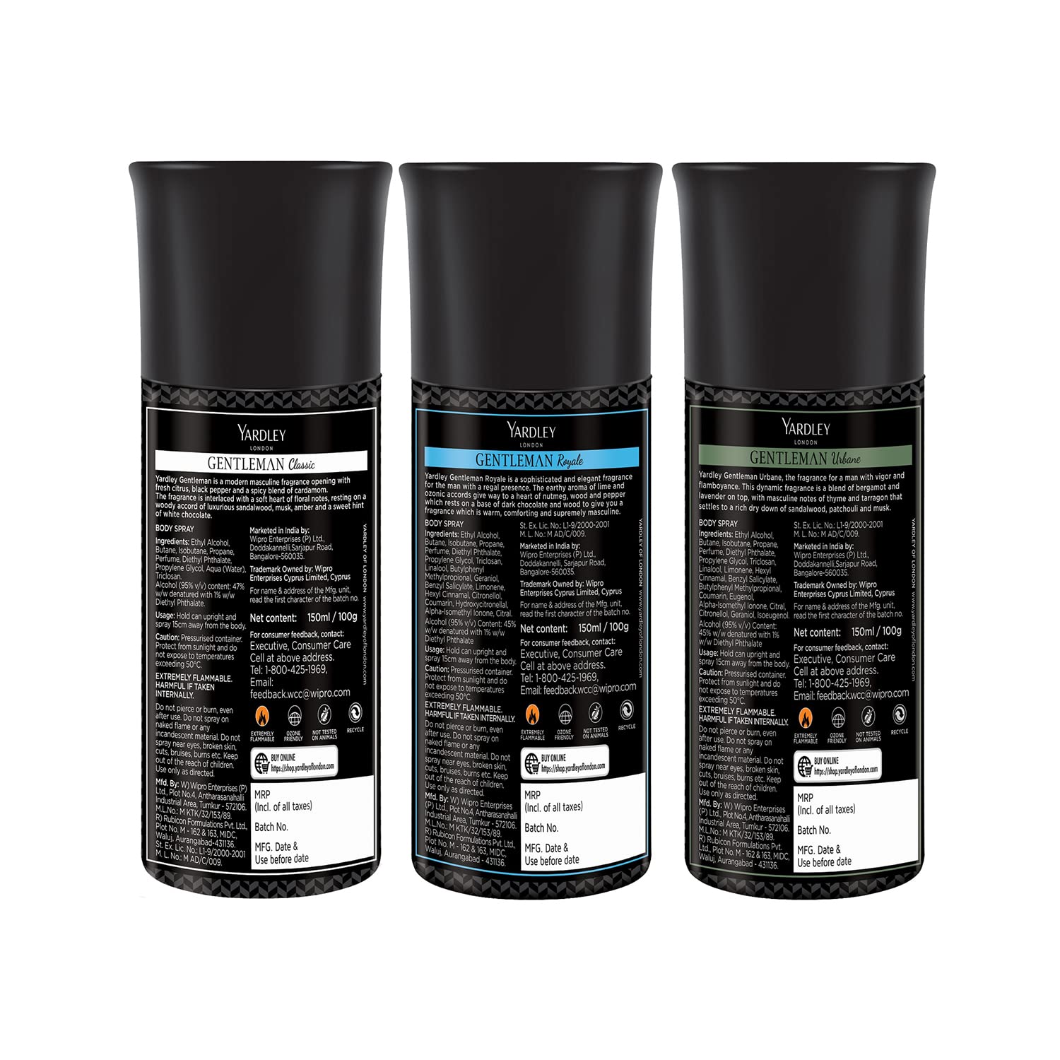 Immerse yourself in the essence of sophistication with the Yardley London Gentleman Deodorant Body Spray Assorted Pack for Men. This curated collection features three distinguished fragrances that redefine your aura. Begin with the regal elegance of Gentleman Royale blending earthy lime Ozonic accords nutmeg wood and pepper culminating in a warm base of dark chocolate and wood. Move on to the refreshing fusion of bergamot lavender thyme tarragon sandalwood patchouli and musk in Gentleman Urbane. Conclude with Gentleman Classic a timeless blend of fresh notes soft florals and luxurious woody accords. Each fragrance ensures enduring confidence and energy leaving a lasting impression. From The House of Yardley this assorted pack encapsulates Yardley's 250 years of legacy embodying Englishness luxury quality and natural fragrances. Trust Yardley London to make a statement of refined taste leaving an indelible mark on both men and women.