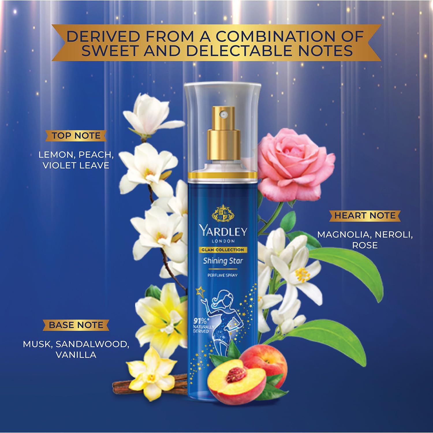 From dazzling nights to radiant days Yardley London Glam Collection is a mélange of alluring fragrances carefully crafted for the glamourous you! Step Up The Glam with Shining Star - an alluring fragrance that opens with fresh Lemon and Peach. At its heart it has the exquisite Neroli Magnolia and Rose. The sweetness of Vanilla at the base lingers on lasting as long as your radiance.