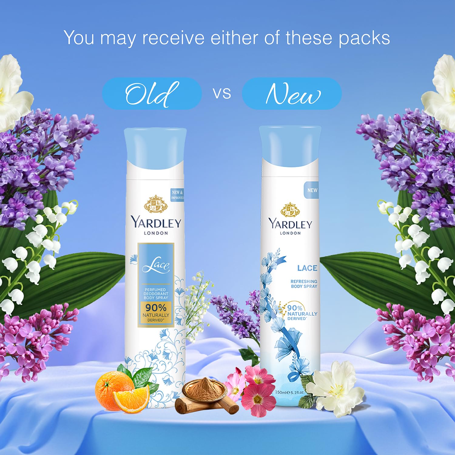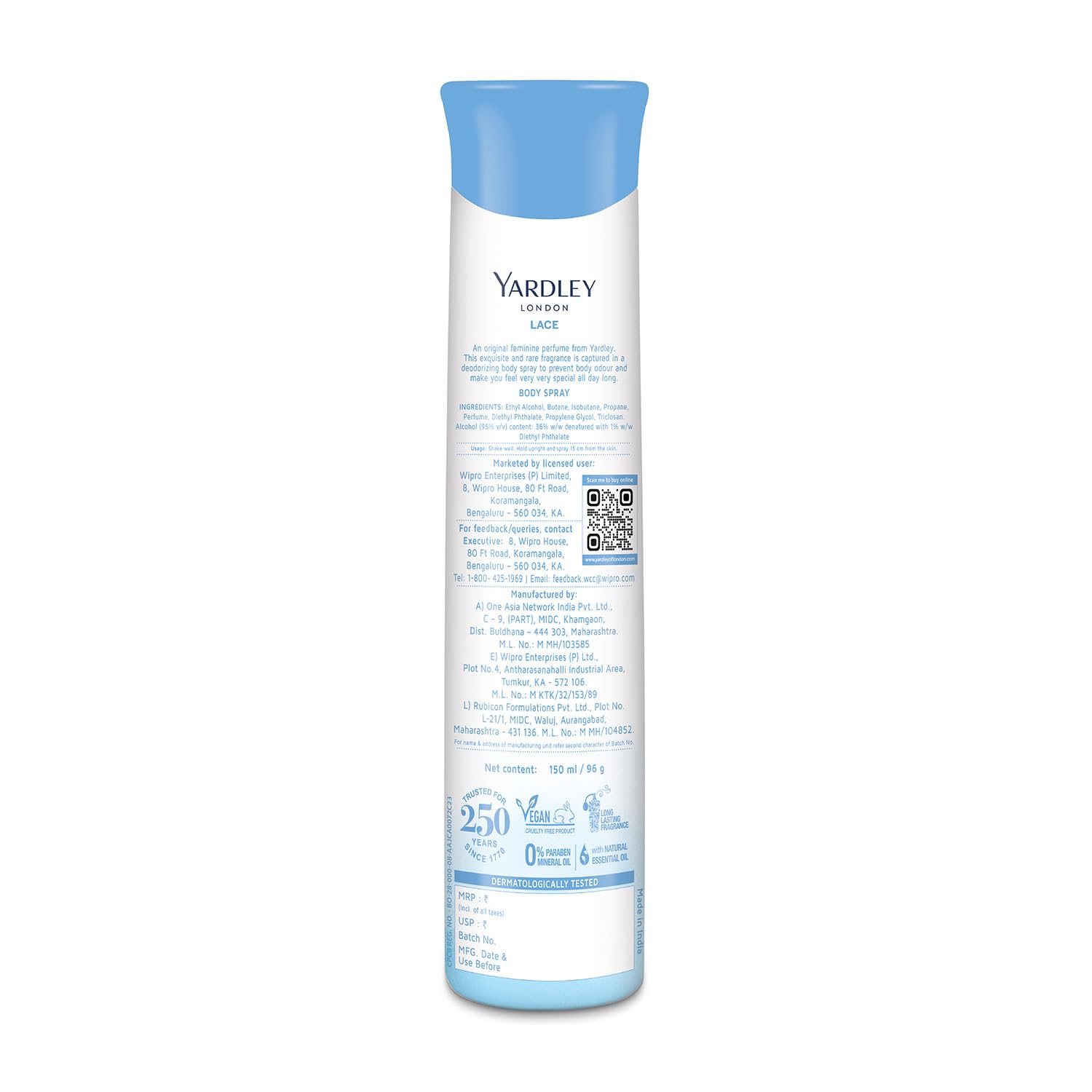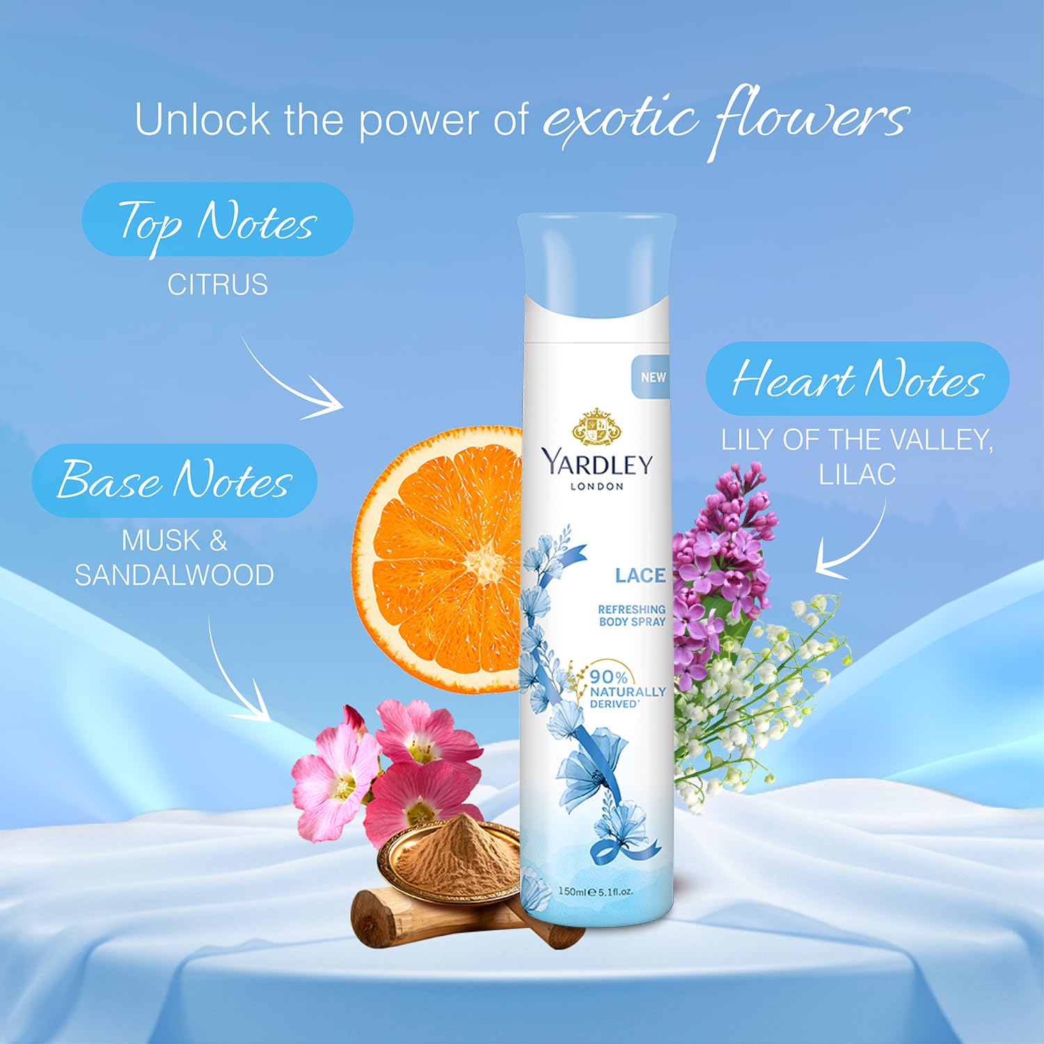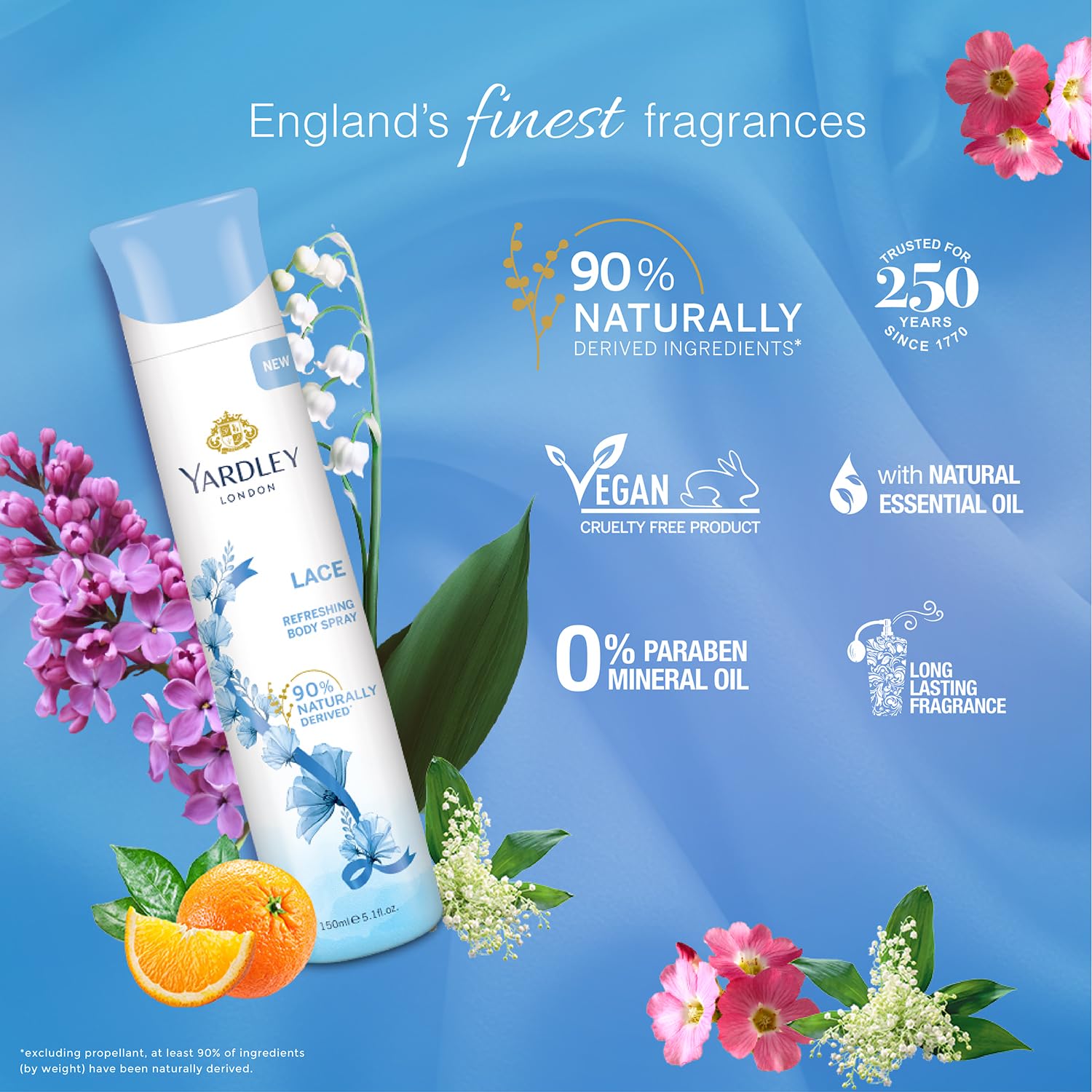 Indulge in the grace and allure of Yardley London's Lace Perfumed Deo a fragrance that captures the essence of English Royalty and the timeless elegance of lace fabric. This 150ml bottle holds more than just a scent; it holds the promise of feeling special every day. With each spritz you'll be transported to the days of grand balls and derby races where lace was synonymous with delicacy and charm. The fragrance caresses your body much like the fabric itself leaving behind a subtle yet enchanting aroma that lingers throughout the day. It's a celebration of womanhood and the joy of being you. The House of Yardley known for its rich heritage spanning over 250 years specialises in crafting classic and premium floral fragrances. With Yardley you're not just buying a perfume; you're investing in a tradition of English luxury and sophistication. Elevate your personal care routine with Yardley Lace Perfumed Deo a fragrant embodiment of the quintessential English fragrance. It's a nod to history a celebration of your femininity and a promise of enduring freshness because every day should feel as special as you are.