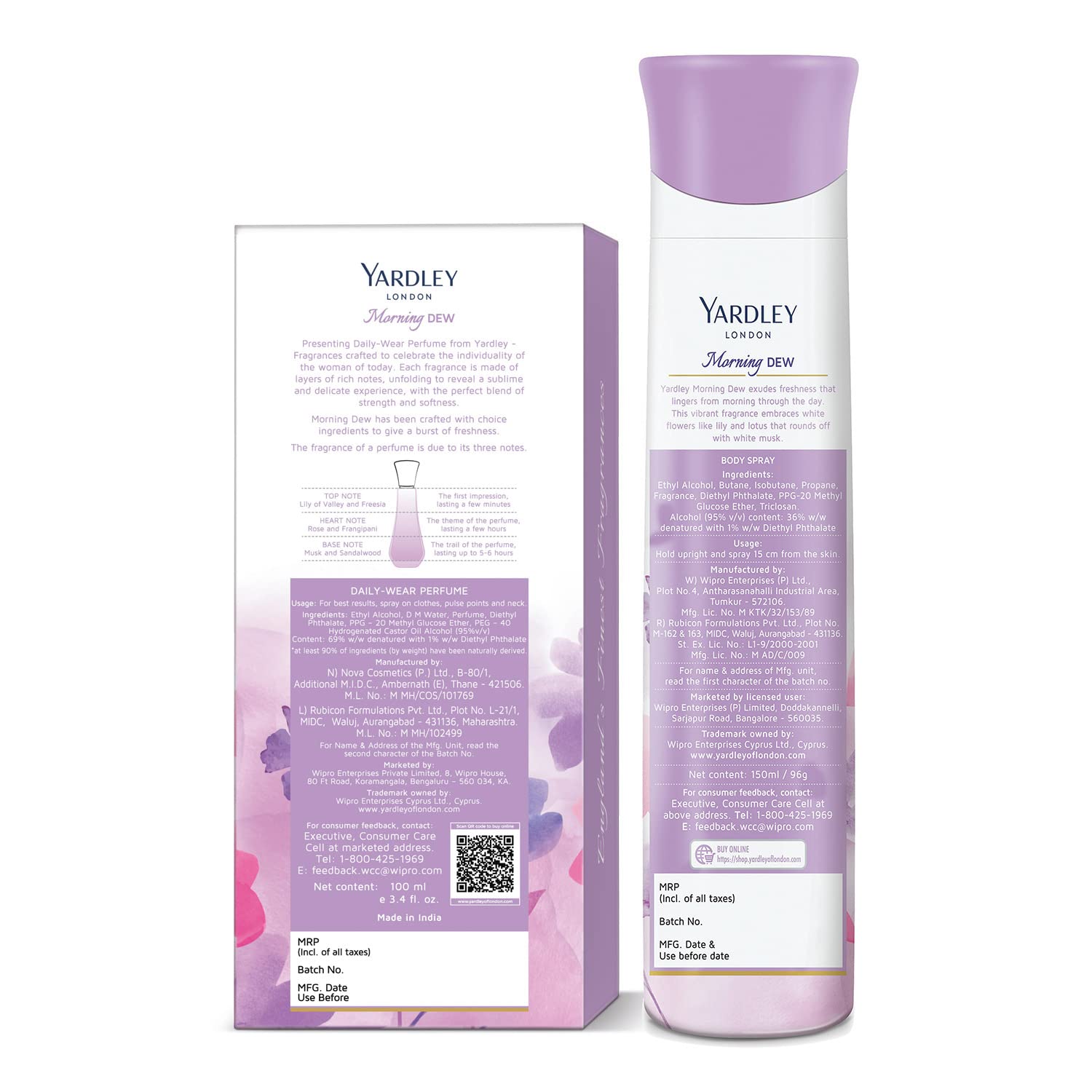 Yardley London Morning Dew Daily Wear Perfume & Refreshing Deodorant Body Spray Combo Pack| Lily of Valley & Frangipani - Fresh Floral Fragrance| 90% Naturally Derived| Daily Wear Perfume & Body Deodorant for Women| 100ml+150ml