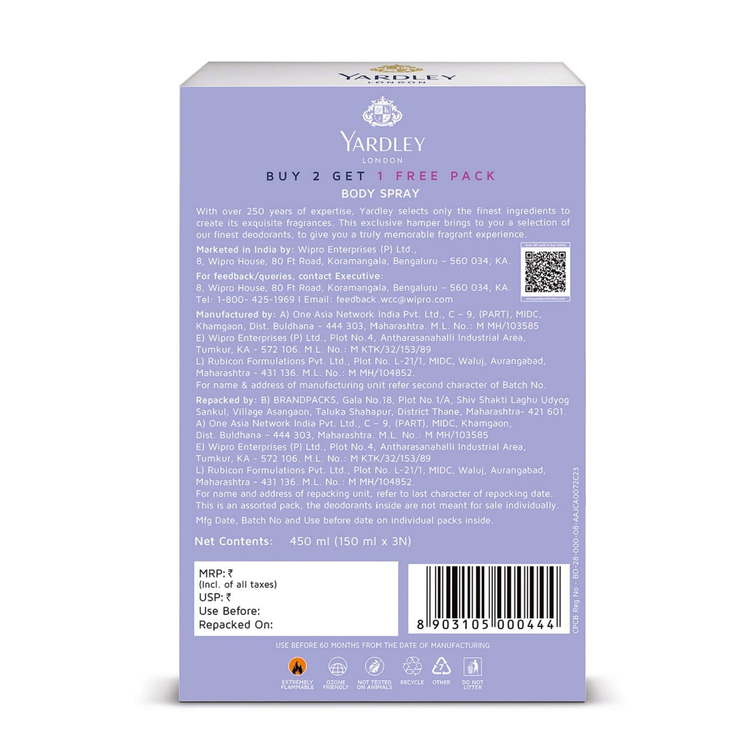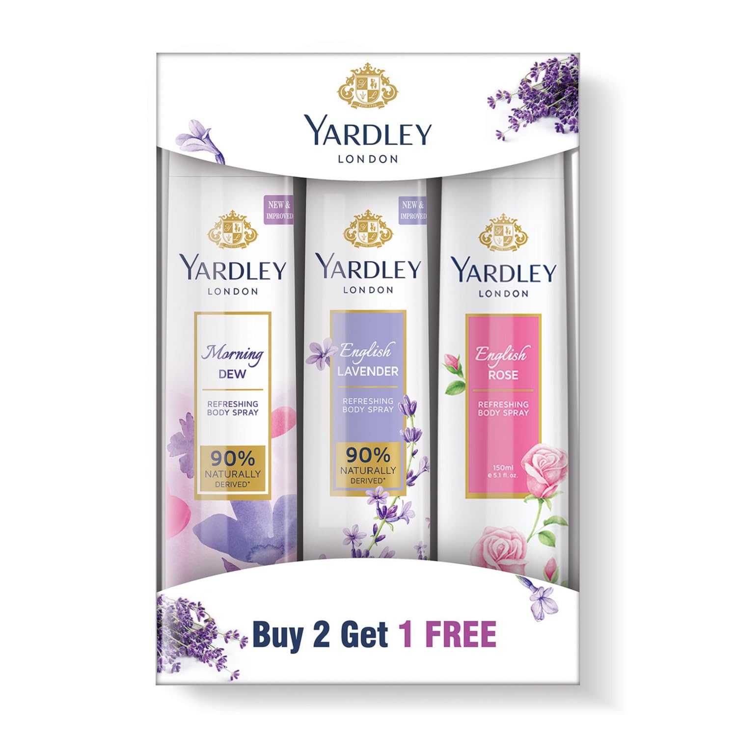 Embark on a sensory journey with the Yardley London Deodorant Body Spray Assorted Pack a curated collection of timeless elegance and English beauty. Indulge in the delicate allure of English roses Raspberry and Sandalwood with the English Rose variant perfect for any occasion. Capture the essence of calm and sophistication with the English Lavender blending floral freshness and musk undertones. For a burst of morning freshness the Morning Dew variant combines Freesia Rose Lily of the Valley and Musk setting a cheerful tone for your day. Each spray is a harmonious fusion of luxury quality and natural beauty reflecting Yardley's legacy of over 250 years. Elevate your senses and embrace sophistication with the Yardley London Deodorant Body Spray Assorted Pack.