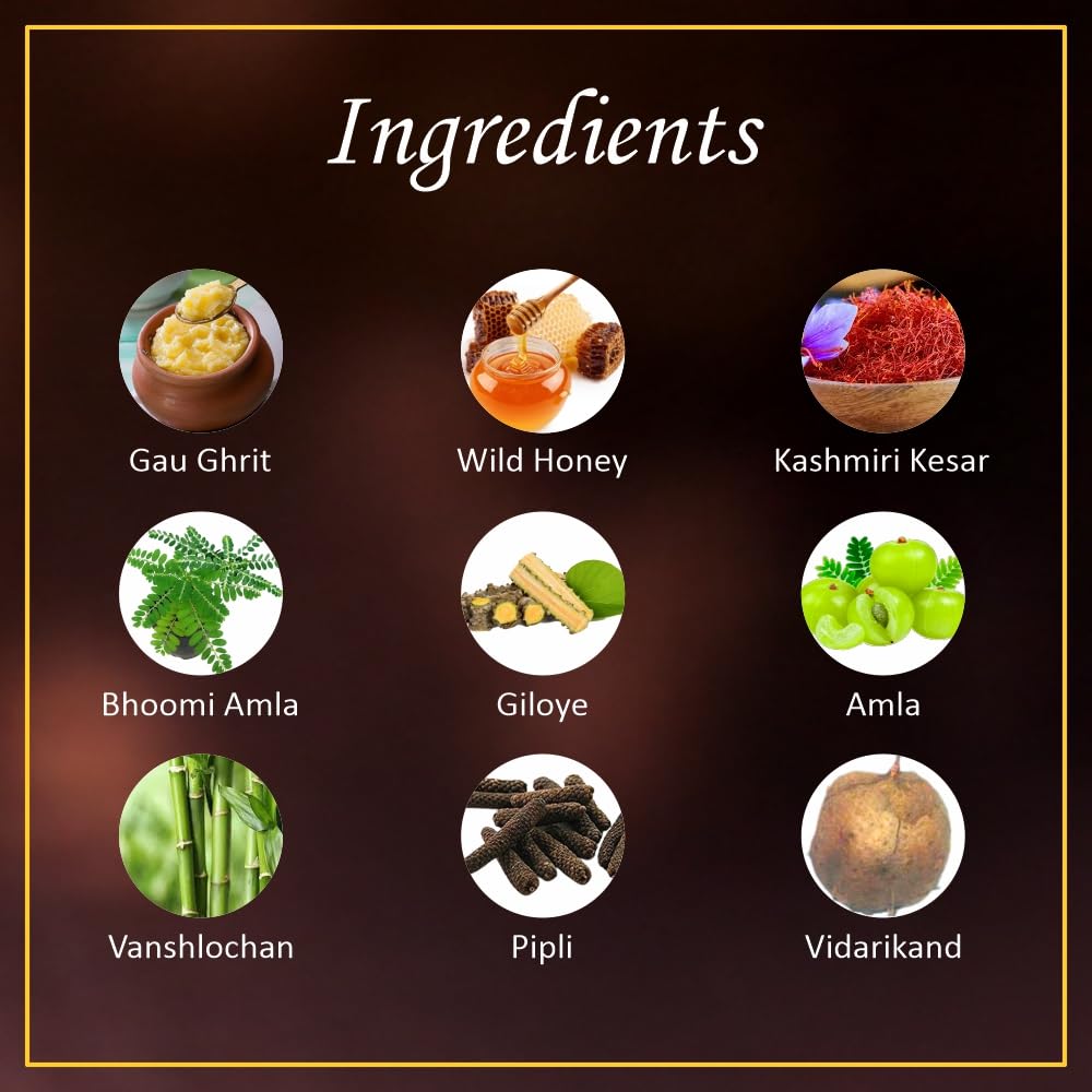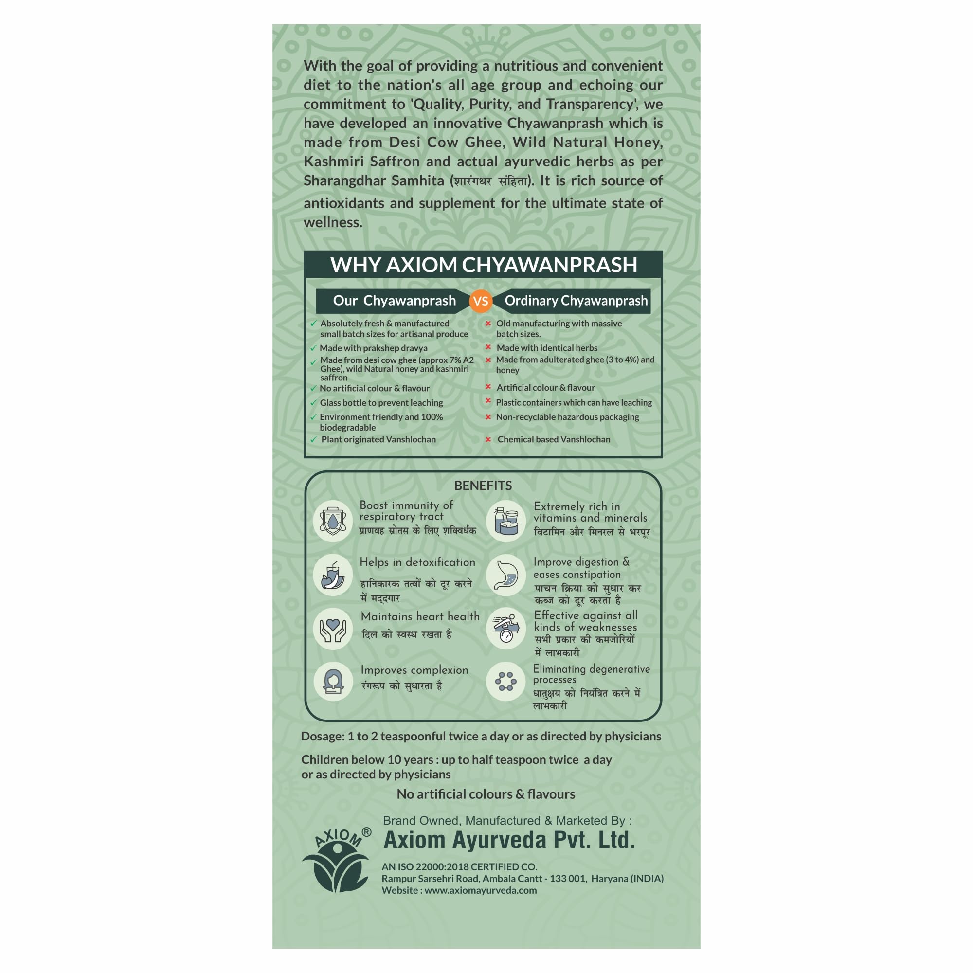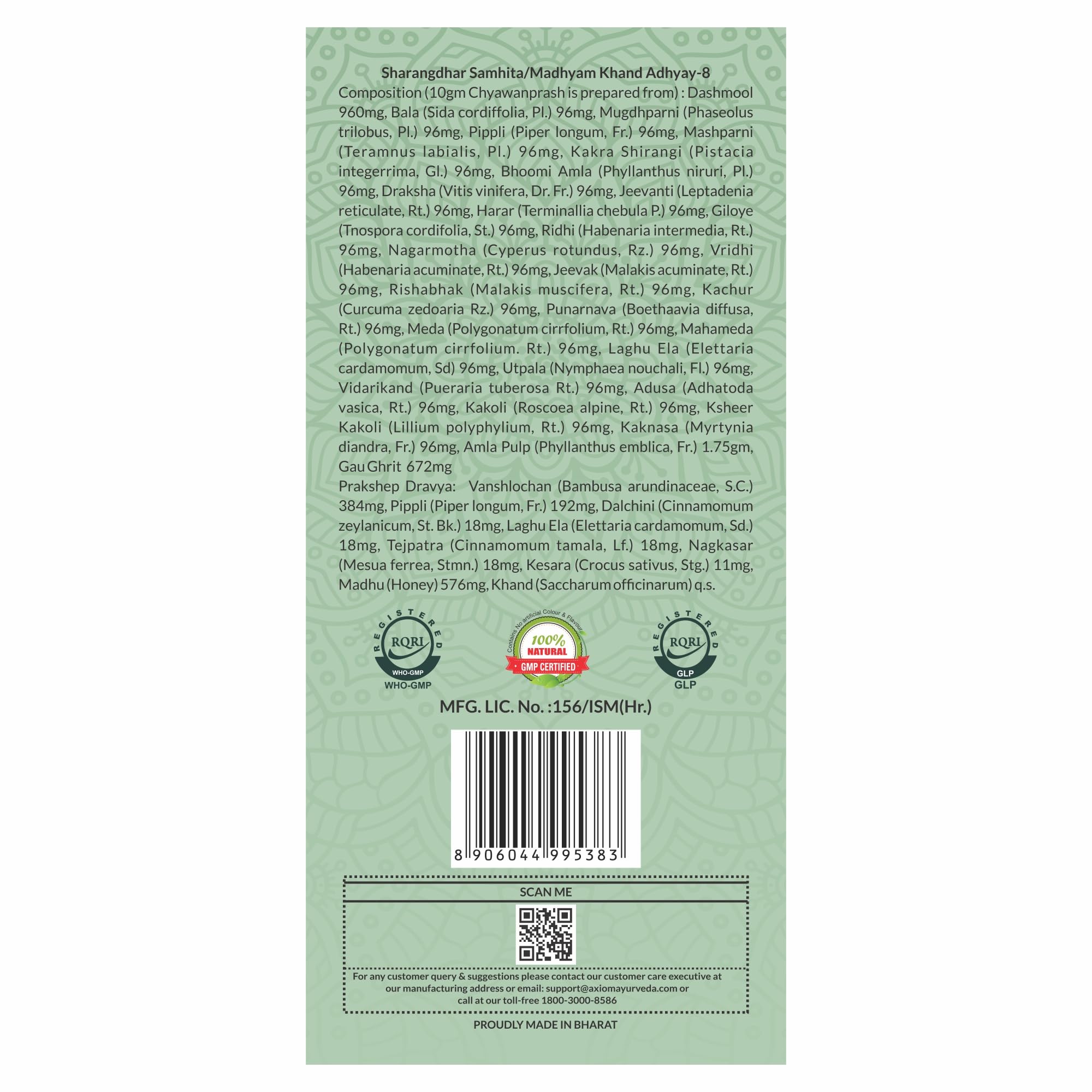 CERTIFICATION & DOSES: Axiom Royal Ayurvedic Chyawanprash is a WHO GMP GLP certified. Chyawanprash can be used by all age groups in every season as its ingredients nullify the unpleasant effects of intense weather and climate or environmental change.