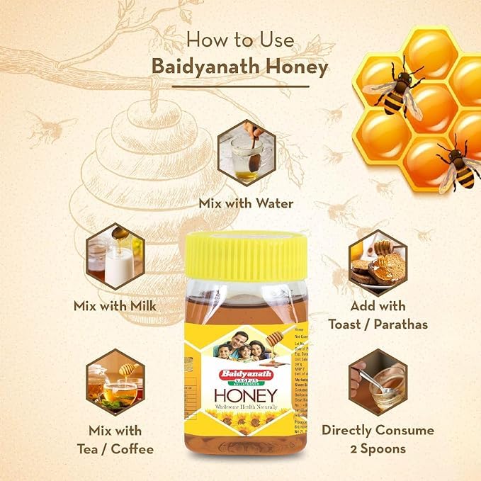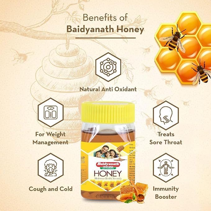 Baidyanath Chyawanprash Special is made from natural herbs. It is useful for all age groups. Dosage of it is 1 to 2 tablespoons twice a day.It is made from ingredients like fresh Amla Pipal Giloy Madhu Riddhi Chhoti Elaichi Safed Chandan Ashwagandha Ghrit.Baidyanath Madhu is special because it is 100% Pure 100% Natural and nutritious. It comes straight from the honeycombs of several honey bees. While Madhu is known to help in weight loss and getting purified skin consuming honey on a regular basis can protect you from a cough and cold. The purity of Baidyanath Madhu makes it extra effective in treatment of a cough cold and chest infections.