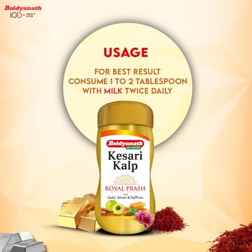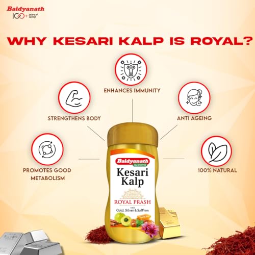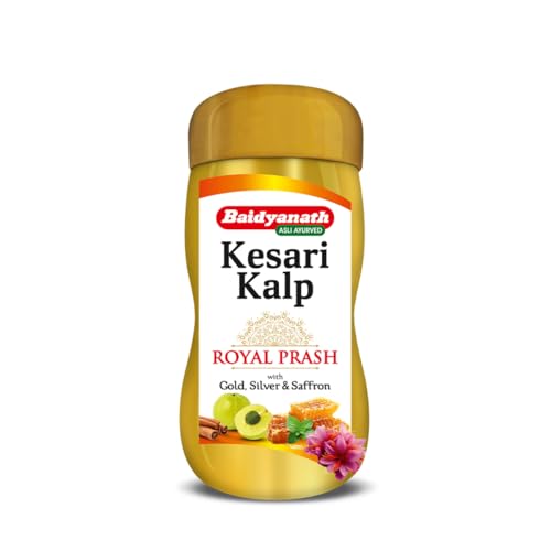 Baidyanath Kesari Kalp Royal Chyawanprash is enriched with Gold Silver & Saffron with 44 herbs and minerals that help boost energy and vitality. Baidyanath Kesari Kalp Royal Chyawanprash is a unique research formula and is an Ayurvedic tonic that is formulated with the combination of rare herbs rich spices and fruits by renowned Ayurvedic scholars and Baidyanath's Research Foundation. Made using responsibly sourced ingredients this product benefits and nourishes the body and helps maintain youthful energy and vigour.