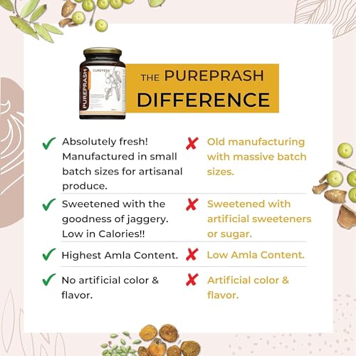 • PUREPRASH FRESHNESS: Cureveda Pureprash is made in small batch sizes to prepare fresh effective chyawanprash which actually gives results. We dont amla from previous seasons but prepare fresh batch of sustainably sourced amla to get the true benefit of Vi