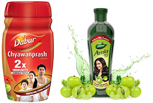 Dabur Chyawanprash : 2X Immunity helps build Strength and for Stamina â 950gDo you think your child has inner strength? Do you worry that your child will fall ill? Do you feel that your child may miss school due to falling ill? Do you doubt that only good food is not enough for your childâs good health? If your answer to any of the above questions is yes then Dabur Chyawanprash is the answer to your childâs health worries - A recipe used in Ayurveda since ancient timeschyawanprash offers a wide range of health benefits. Dabur Chyawanprash provides strong immunity and good digestion for children and adults alike. Two spoons daily of Dabur Chyawanprash supports immunity and is beneficial for overall health and well-being. It is also good for the digestive and respiratory systems. The primary action of Dabur Chyawanprash is to bolster the immune system and to support the bodyâs natural ability to fight illnesses . Amalaki (the main ingredient) aids in the elimination of ama (toxins). Therefore regular use of Dabur Chyawanprash helps strengthen bodyâs natural defence systems. It builds the essence of immunity promoting systemic health and well-being. ingredients of Dabur Chyawanprash are scientifically validated for their beneficial effects on health. It is considered one of the best family tonicsâsuitable for all ages from young children to the elderly. (Children above 3 years of age).Dabur Amla Hair Oil for Strong Long and Thick Hair -450mlDabur Amla Hair Oil infuses your hair with strength thanks to Amla extract which is renowned as the power fruit for hair which has been traditionally used as a hair tonic.It is a beneficial product for scalp health . Dabur Amla hair oil penetrates well into your scalp nourishes your scalp & hair with the power of Amla. Dabur Amla helps make your hair strong from the roots and also helps in hair growth to give stronger longer & thicker hair. Now Strengthen your hair from roots to tips!