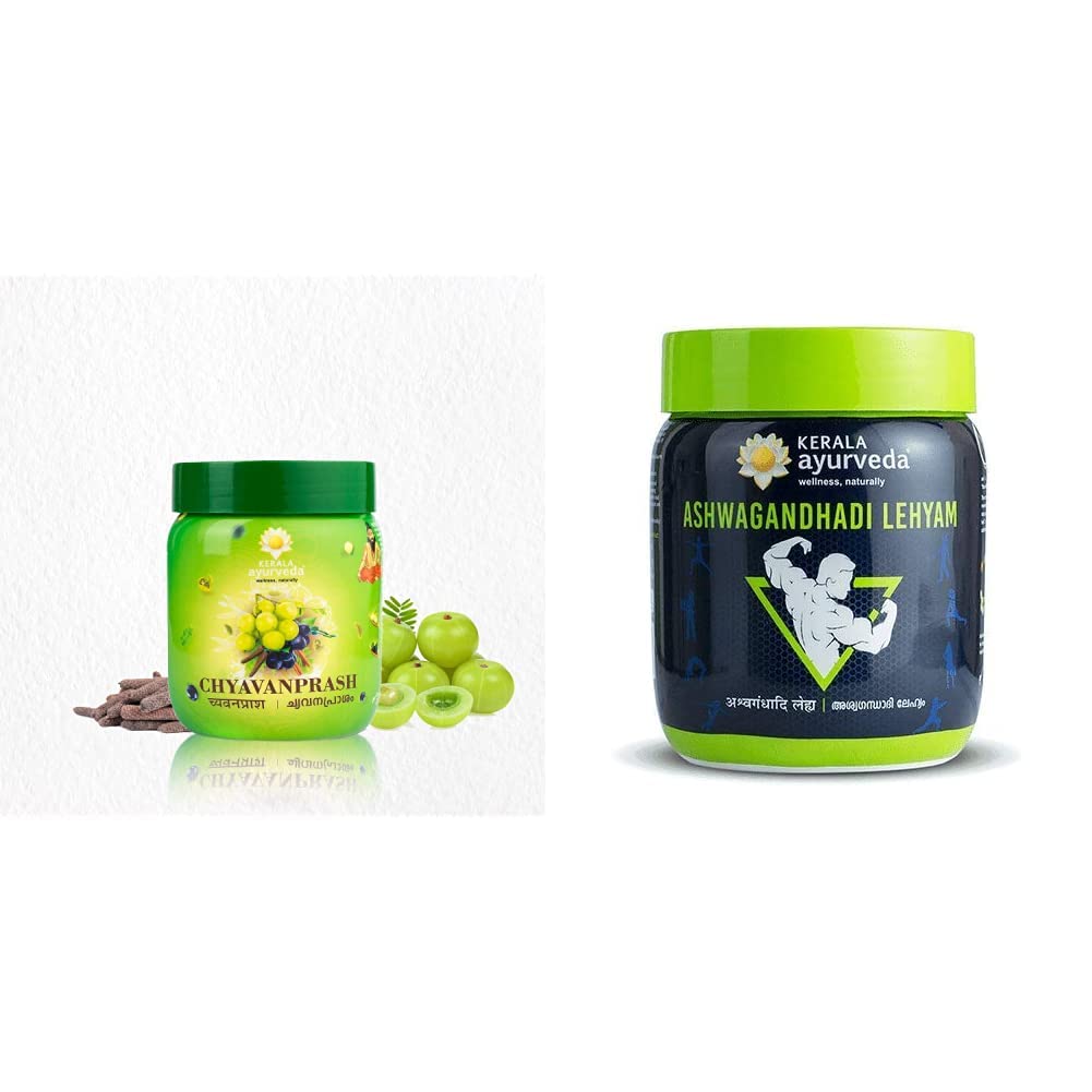 Kerala Ayurveda Aswagandhadi Lehyam - 500 gIngredients: Aswagandhadi lehyam (qty/500 g) guda (jaggery) - 312.5 G sarkara (sugar) - 62.5 G ghrita (ghee) - 37.5 G asvagandha (withania somnifera) - 22.5 G thila (sesamum indicum) - 22.5 G masha (phaseolus mungo) - 9.5 G sunthi (zingiber officinale) - 9.5 G sveta jeera (cuminum cyminum) - 7.5 G yashtimadhu (glycyrrhiza glabra) - 5 g musli (curculigo orchiodes) - 5 g neeli (indigofera tinctoria) - 1 g ksira vidari (ipomea paniculata) - 1 g.Kerala Ayurveda Chyavanprash- Original 5000-year-old recipe for strength immunity and longevity- 50 original herbs sweetened with jaggery and honey free from artificial sugar.Ingredients: Each 500 gm of chyavanprash "bilva/aegle marmelos rt./St. Bk. Dct. 0.096g agnimantha/premna integrifolia rt./St. Bk. Dct. 0.096g syonaka/oroxylum indicum rt./St. Bk. Dct. 0.096g gambhari/gmelina arborea rt./St. Bk. Dct. 0.096g patala/stereospermum suaveolens rt./St. Bk. Dct. 0.096g balaa/sida cordifolia rt. Dct. 0.096g salaparni/desmodium gangeticum pl. Dct. 0.096g prasniparni/uraria picta pl. Dct. 0.096g mudgaparni/phaseolus trilobus pl. Dct. 0.096g masaparni/teramnus labialis pl. Dct. 0.096g pippali/piper longum fr. Dct. 0.096g svadamstra/tribulus terrestris fr. Dct. 0.096g brahati/solanum indicum rt. Dct. 0.096g kantakari/solanum surattense fr. Dct. 0.096g sringi /pistacia integerrima lf.G. Dct. 0.096g tamlaki/phyllanthus amarus rt. Dct. 0.096g draksha/vitis vinifera fr. Dct. 0.096g jivanthi/holostemma ada-kodien rt. Dct. 0.096g puskara/inula racemosa rt. Dct. 0.096g agaru/aquillaria agallocha ht. Wd. Dct. 0.096g abhaya/terminalia chebula p. Dct. 0.096g amruth/tinospora cordifolia st. Dct. 0.096g riddhi/habenaria intermedia pl. Dct. 0.096g jivaka/malaxis acuminata rt.T. Dct. 0.096g rasabhaka/malaxis muscifera rt.T. Dct. 0.096g shati/kaempferia galanga rz. Dct. 0.096g mustha/cyperus rotundus rt.T. Dct. 0.096g punarnnava/boerhaavia diffusa rt. Dct. 0.096g meda/polygonatum cirrhifolium pl.