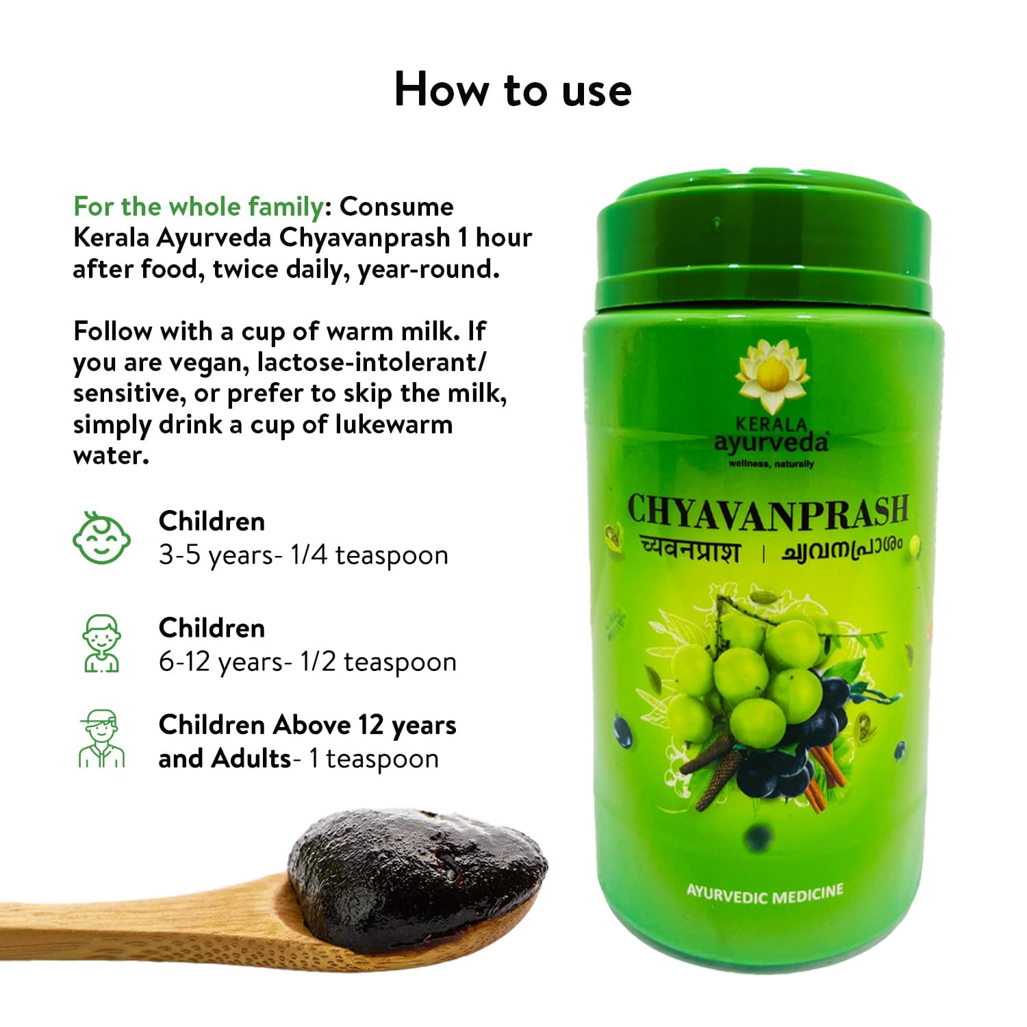 YEAR ROUND USAGE Kerala Ayurveda Chyawanprash 800 grams is suitable for daily consumption by the entire family. Best enjoyed after a meal with milk or lukewarm water this organic chyawanprash enhances immunity and overall health perfect for kids adults an