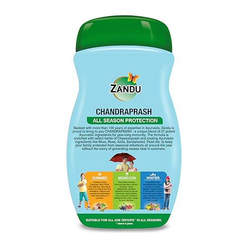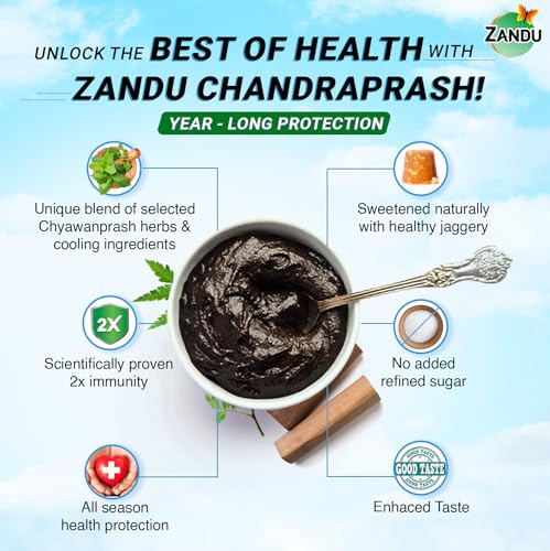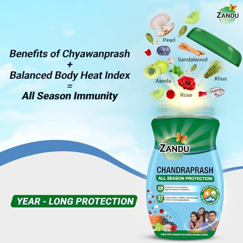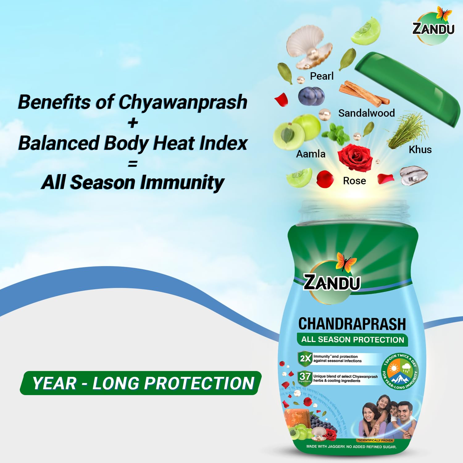 While seasons change maintaining strength stamina energy overall health and unwavering immunity is vital. Hence Zandu has introduced Zandu Chandraprash a unique blend of 37 Ayurvedic ingredients that has selected herbs of chyawanprash and cooling ingredients for providing all year-round immunity. All the ingredients in this chandraprash are carefully chosen to protect you from excess heat cold and common ailments during summer monsoon and winter. It contains ingredients like khus amla chandan moti pishti mishreya and mint which are well-known for their cooling effects helps provide relieve from burning sensation and prevents dehydration in summers while herbs like Sunthi Draksha and Nagkeshar shields against common monsoon infections. In winter it guards against cold and cough ensuring warmth. Ayurvedic experts with more than decades of expertise in area of Ayurveda have prepared Zandu Chandraprash which is scientifically proven for 2x immunity* & it contains 100% ayurvedic ingredients and no refined sugar. Simply consume one spoonful twice a day with milk to stay strong & immune all year long!