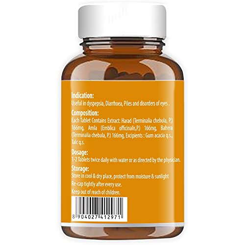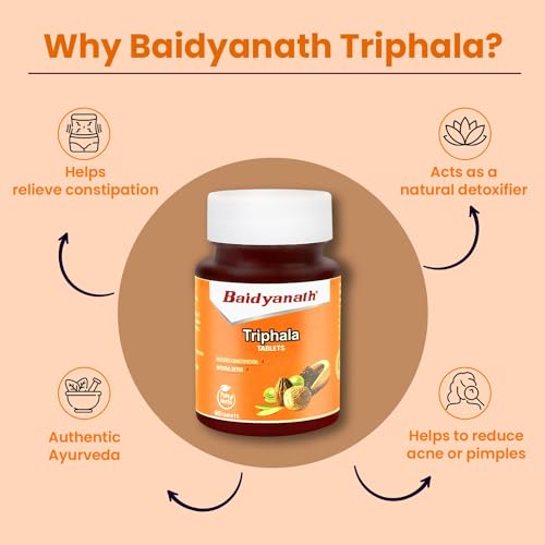 Baidyanath Triphala Tablets is a powerful and versatile herbal formulation that has been treasured for centuries. Triphala is a blend of three potent fruits - Amla Haritaki & Bibhitaki which is renowned for its multifaceted health benefits. Triphala is celebrated for its natural detoxifying properties. It gently cleanses your digestive system helping flush toxins and promote a healthy clear complexion. Regular use of Triphala can support your body's natural detoxification processes leaving you feeling rejuvenated from the inside out. Packed with antioxidants Triphala enhances your body's defense mechanisms helping you stay resilient against common illnesses and seasonal challenges. Strengthen your immunity the natural way. Triphala is recognized for its ability to promote blood purification. It supports heart health by maintaining cholesterol levels within the normal range and assisting in healthy blood circulation. Incorporate Triphala into your routine for a heart-healthy lifestyle. Achieving and maintaining a healthy weight is easier with Triphala. It aids in digestion and metabolism making it a valuable addition to your weight management journey. Combined with a balanced diet and exercise Triphala can assist you in achieving your wellness goals. Baidyanath Triphala Tablets are also good for your eyes. Triphala's natural compounds can help soothe and maintain eye health supporting clear and comfortable vision. Whether you're spending long hours in front of a screen or just want to keep your eyes in top shape Triphala can be your ally. Crafted with care and adherence to Ayurvedic traditions these tablets are your key to well-being inside and out.