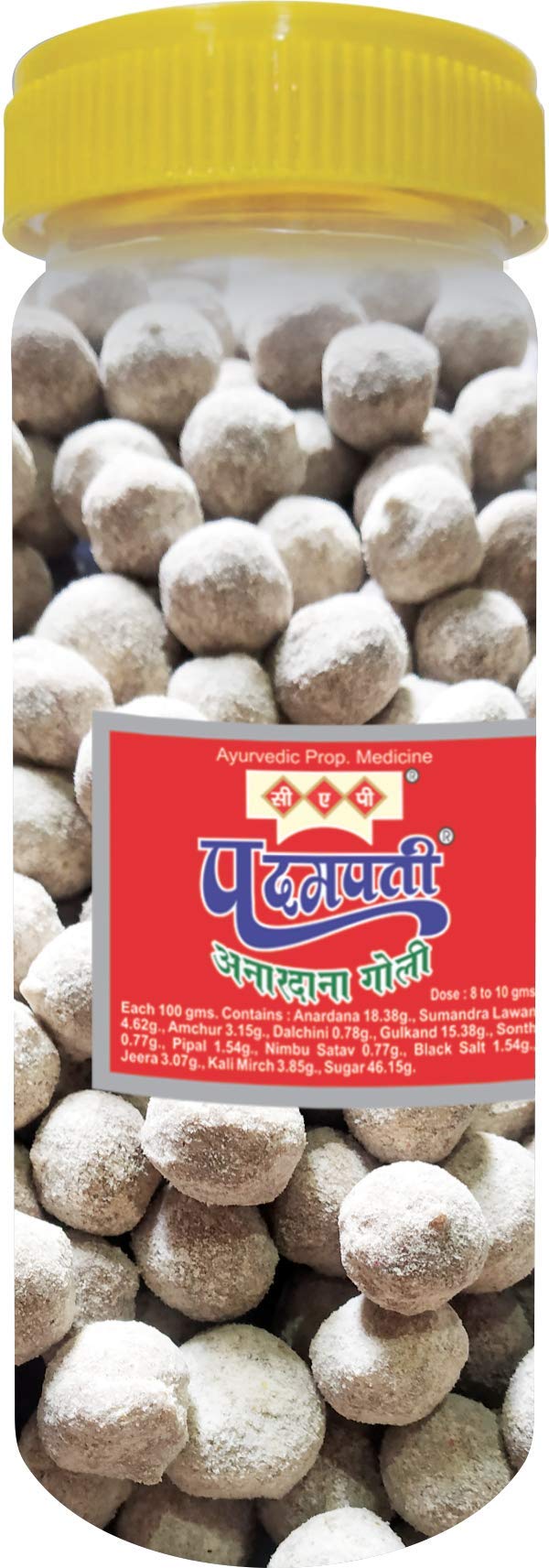 padampati anardana goli is made up of fine dry anardana dry mango black salt and perfect combination of spices. to be made up in very hygienic manner. having superb taste and digestive its an Ayurvedic prop. product perfect for children also.