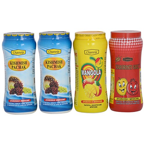A COMBO PACK OF KARORPATI GOLI (anardana goli.) KISHMISH PACHAK AND MANGOLA. " THE CHATPATI CHURAN TREAT AFTER ANYTHING YOU EAT " KARORPATI GOLI IS A ROYAL COMBINATION OF ANARDANA (BEDANA) GULKAND (CRUSHED ROSE LEAVES) ALONG WITH RICH INDIAN SPICES TO GIVE A KHATTA MITHA MAZEDAAR SWAAD. IT IS ALSO KNOWN FOR ITS EFFICACY IN DIGESTION. A LAAJAWAB PRODUCT FROM THE HOUSE OF CHAMRIA.IT IS A ALL TIME FAVOURITE OF INDIA SINCE 1860. GOOD HEALTH GREAT TASTE.. KISHMISH PACHAK IS ROYAL COMBINATION OF RICH DRY FRUITS WITH SPICY HERBAL MASALA TO GIVE IT A MOUTH WATERING TASTE AND GOOD HEALTH NATURALLY. IT IS ALSO BENEFICIAL IN BOOSTING IMMUNITY VIGOUR STRENGTH STAMINA. CONSTIPATION PROBLEMS & INDIGESTION. RARE COMBINATION OF HEALTH & DIGESTION TOGETHER. THE TASTY MANGO BITE !!! CHAMRIA MANGOLA IS INDIA'S BEST AAM PAPAD COATED WITH RICH SPICY MASALA WHICH GIVES IT A TANGY TASTE. NOW ENJOY KACHA MANGO THROUGHOUT THE YEAR. A TRADITIONAL GREAT AFTER FOOD APPETIZER.