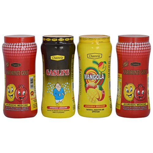 A combo pack of KARORPATI GOLI (anardana goli.) GASLIN & MANGOLA . Karorpati Goli is a royal combination of Anardana (bedana seeds) & Gulkand (prepared from rose petals) along with Rich Indian spices to give it a unique mouth watering taste. Khatta Mitha Anar ka Maza. It is also known for its efficacy in digestion. A renowned "Laajawab" product the ultimate in pachak industry only from the house of CHAMRIA. It is a time tested Favourite of India since 1860. A unique combination of Good Health & Good taste. THE TASTY MANGO BITE !!! CHAMRIA MANGOLA IS INDIA'S BEST AAM PAPAD COATED WITH RICH SPICY MASALA WHICH GIVES IT A TANGY TASTE. NOW ENJOY KACHA MANGO THROUGHOUT THE YEAR. A TRADITIONAL GREAT AFTER FOOD APPETIZER. SAY NO TO GAS ACIDITY & STOMACH TROUBLES. CHAMRIA GASLIN IS A AGE OLD REMEDY FOR GAS WIND INDIGESTION & CONSTIPATION. IT IS RARE COMBINATION OF RICH INDIAN HERBS PROCESSED SCIENTIFICALLY. A REAL TREAT FROM AYURVEDA AND CHAMRIA. " GAS KA ANT.......TURANT"