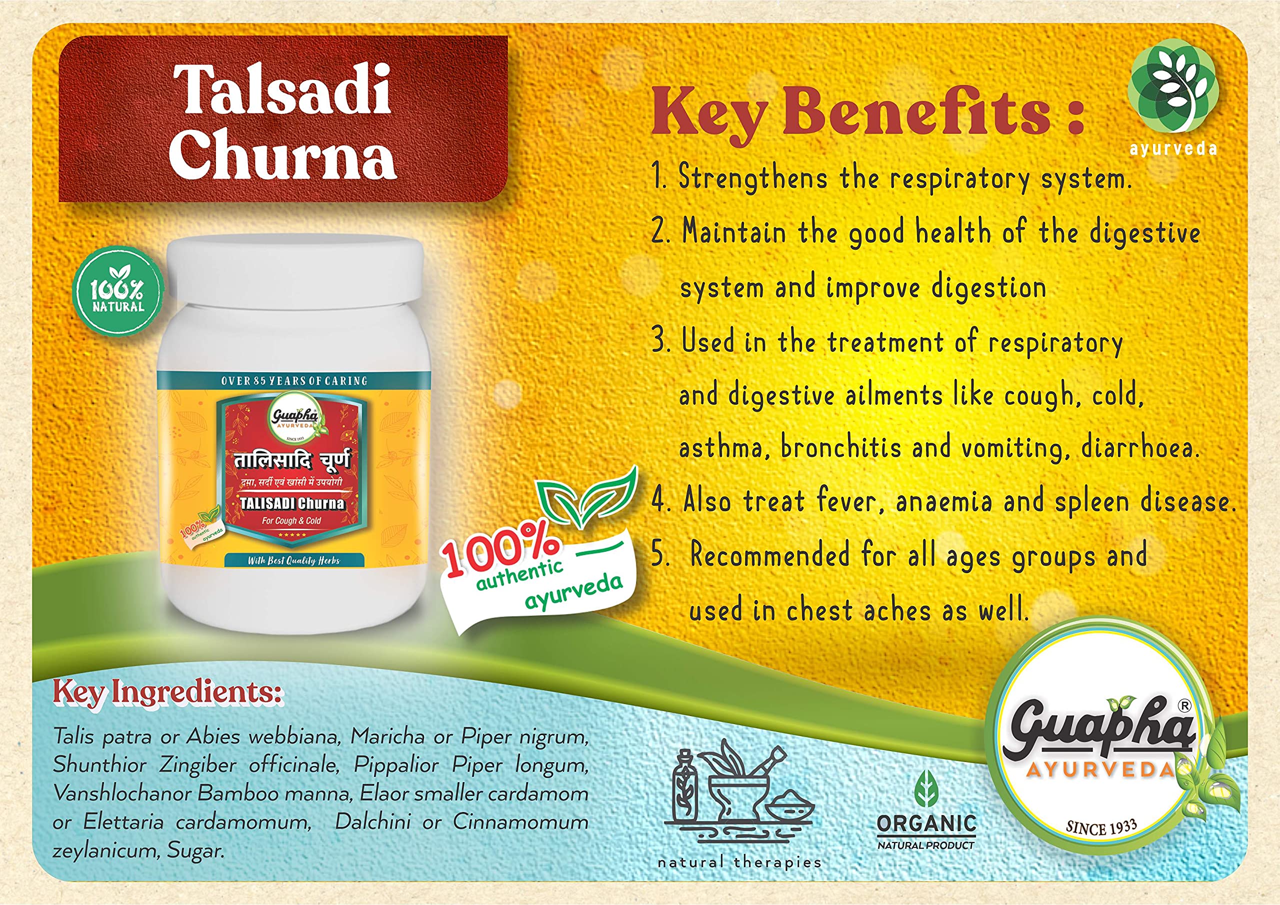 Guapha Ayurveda Talisadi Churna contains Talispatra Maricha Shunthi Pippali Vanshalochan Ela Tvak and Sharkara as major ingredients. An herbal formulation that combines the goodness and unique properties of eight herbs.
