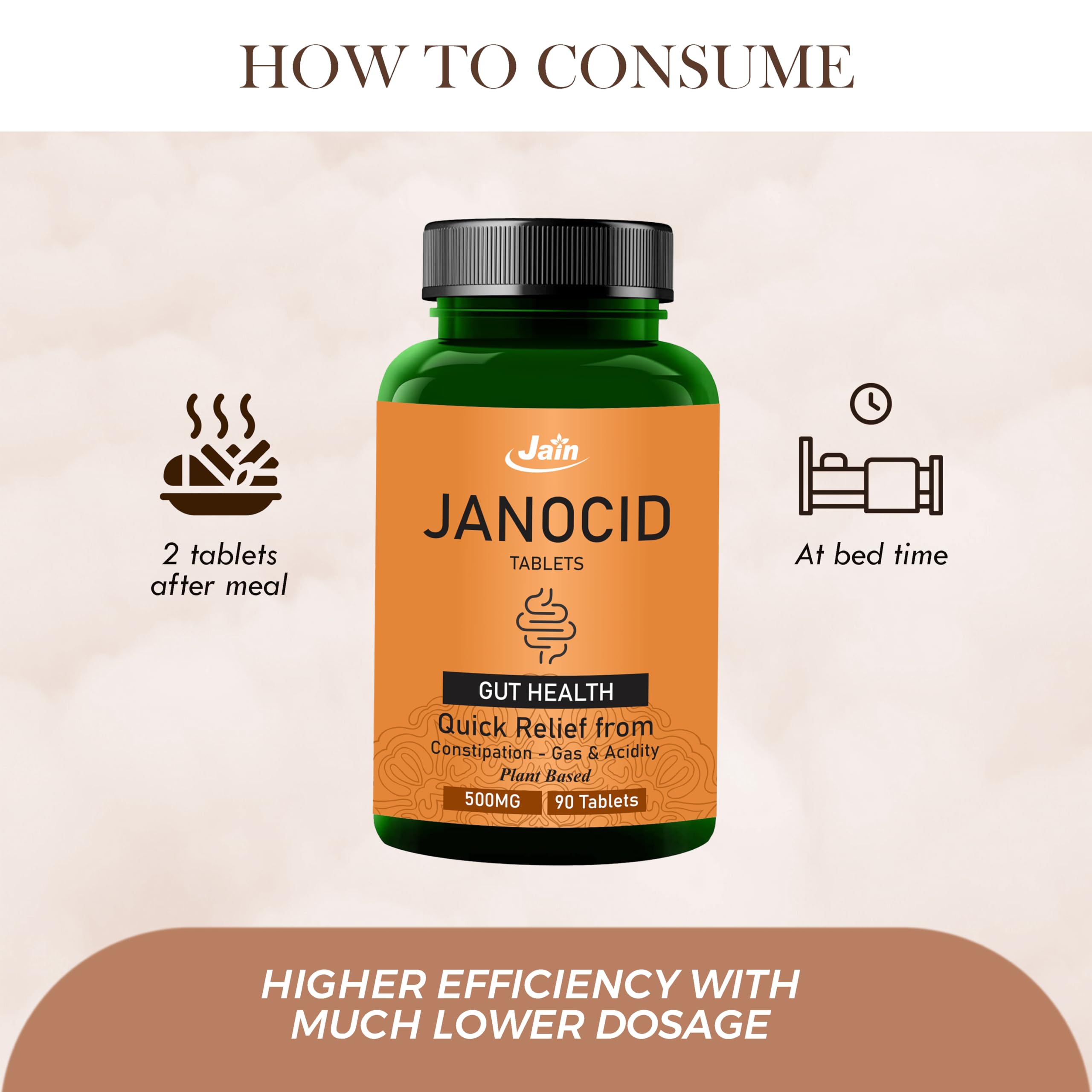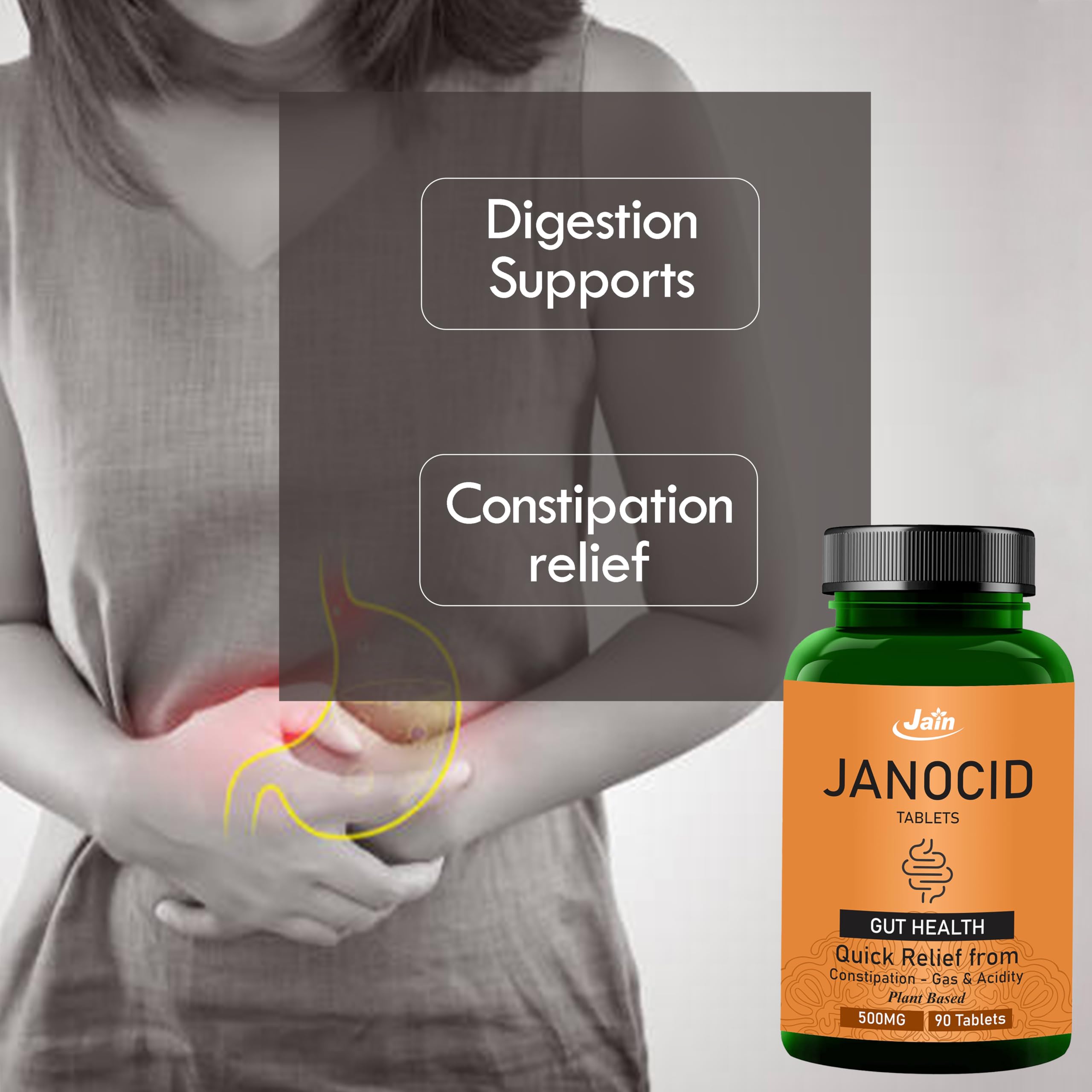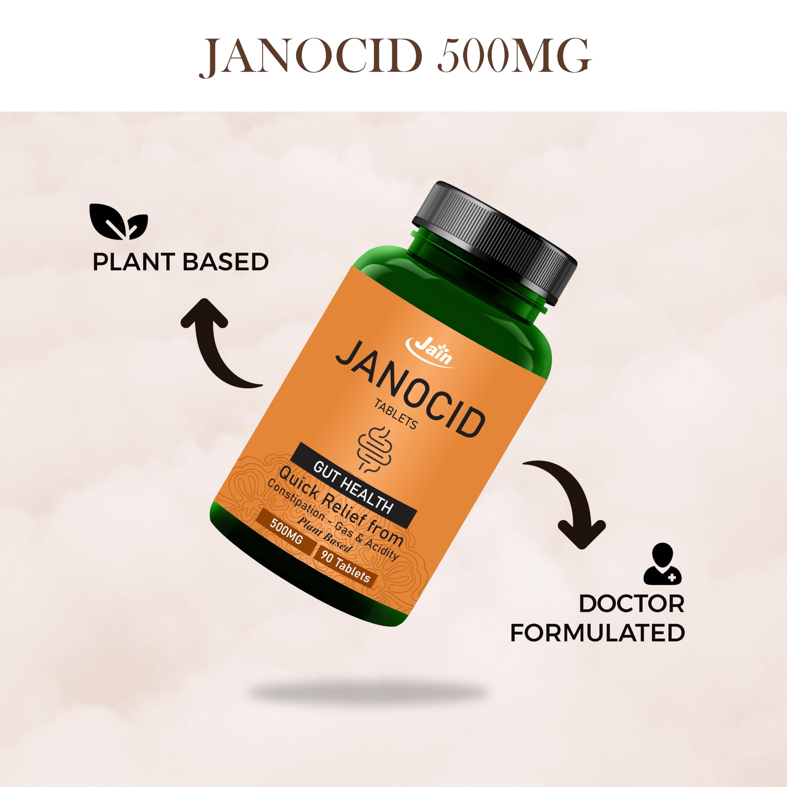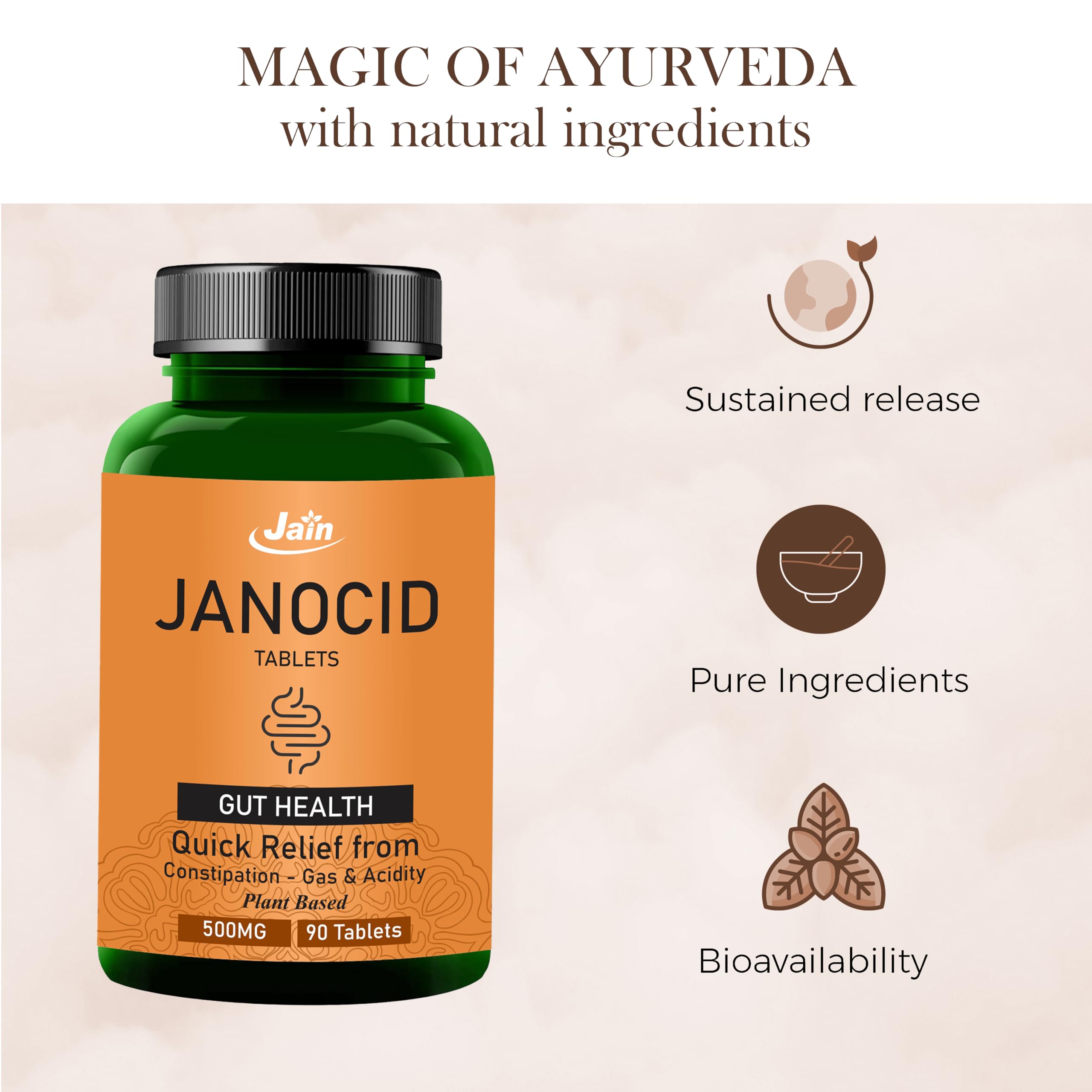Janocid is a proprietary Ayurvedic formulation manufactured by Sri Jain Ayurvedic Pharmacy Hyderabad. It is designed to address common digestive issues such as acidity constipation bloating and indigestion. The tablet combines traditional herbal ingredients known for their digestive and detoxifying properties.