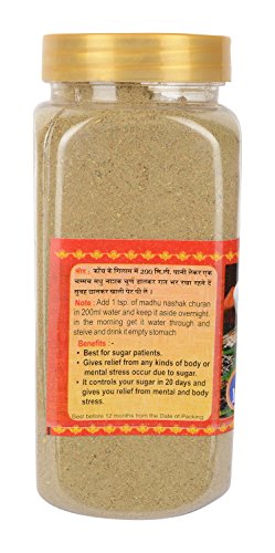 This is a bottle of special madhu nashak churan which weighs around 200 grams. It is made of amla ashwagandha sheelajit jamun guthly gurmaar buty belpatta neempatta karela gokhru methi chiryata kulki paneerdodi safed musli & shatawari. It has a shelf life of 12 months. It is recommended to be stored in a cool and dry place.