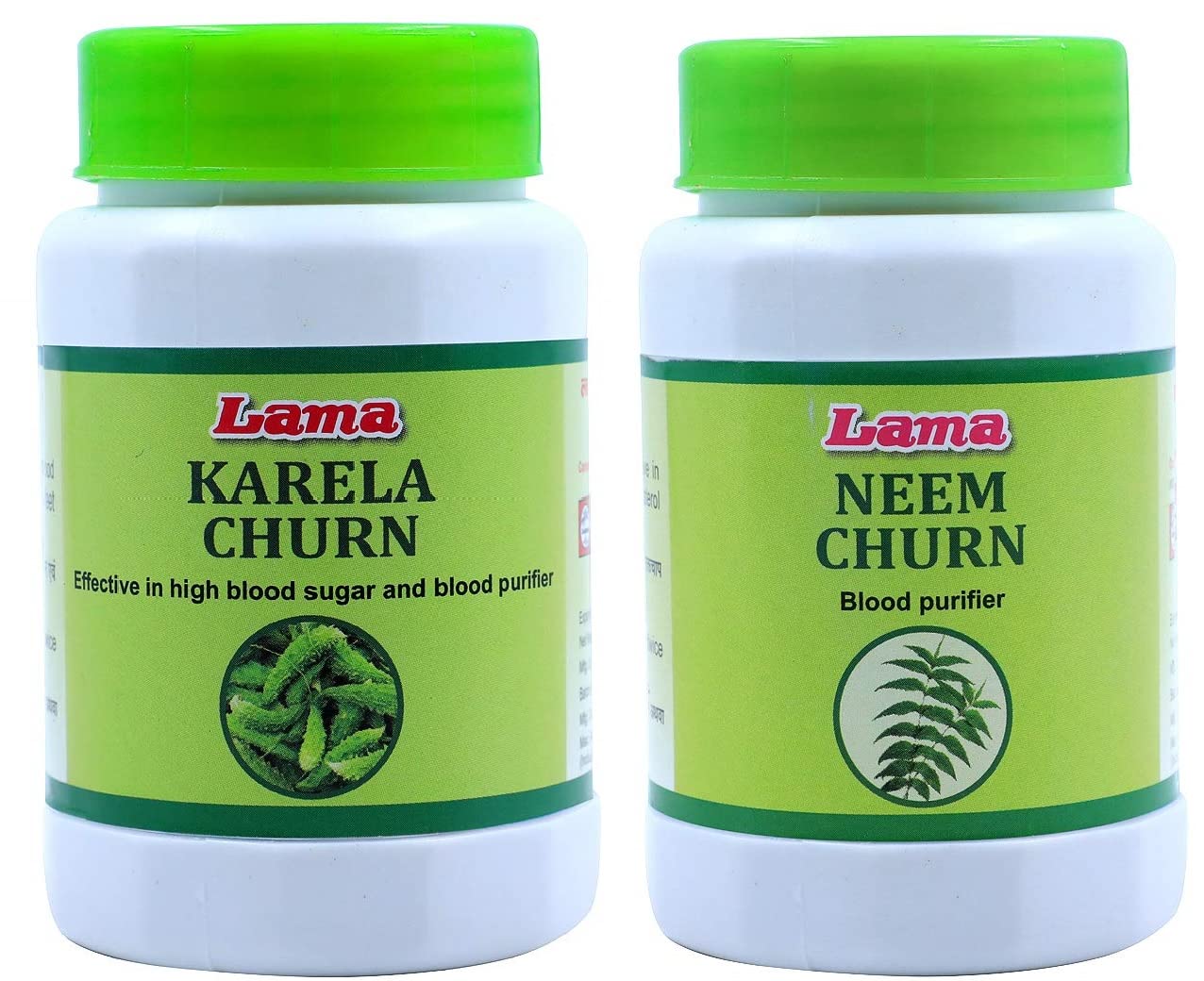 Lama Karela Churn -100 gms + Lama Neem Churn -100 gms (Combo pack of 2). Classical ayurvedic product from Lama Pharmaceuticals. Pack contains 2 Packs of Karela churn (100 g Each) and 2 Packs of Neem Churn (100 g Each)