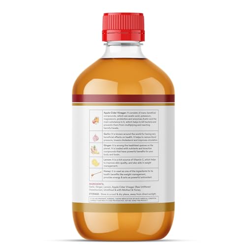 SUPERIOR QUALITY: Our premium Apple Cider Vinegar with Mother of Vinegar is raw unfiltered and unpasteurized and naturally fermented with 5% acidity. A cloudy combination of Apple Cider Vinegar with Mother of Vinegar Garlic Ginger Lemon and Honey. It is widely known to be all-natural cure to so many different conditions. Out product is formulated to enhance lifestyle changes and target many health ailments including acid reflux sore throats hair skin acne circulation weight management balanced pH levels and more. EXCELLENT COMBINATION: An excellent combination of Apple Cider Vinegar with Mother of Vinegar Garlic Ginger Lemon and Honey. Garlic known to have very beneficial health benefits. It helps to improve circulation. Ginger is very good for body and brain. Lemon a natural source of vitamin C is helpful for weight management. Honey also helps in weight management provides energy & is a powerful antioxidant. POWERFUL WEIGHT MANAGEMENT DETOX AND CLEANSER: Through the use of Apple Cider Vinegar weight loss support may be possible due to its cleansing properties which flushes out impurities found in the system. It also naturally aids in digestion and cleaning of intestines. We don't put any artificial ingredients in our premium formulation. Apple Cider Vinegar is one of the best ways to cleanse the body and kill bacteria.RELIABLE PRODUCT: The perfect blend to ensure you are getting the most of our product. Our formula contains no preservatives chemicals artificial ingredients so you can trust that you are using all-natural supplement. Natural ingredients in this product can vary the colour taste and consistency from batch to batch. This does not affect potency or quality.PURITY & POTENCY: Our product contains the most natural and effective formulation of trusted natural ingredients that are carefully processed and manufactured in a GMP certified manufacturing facility so you can be sure that you're safe.