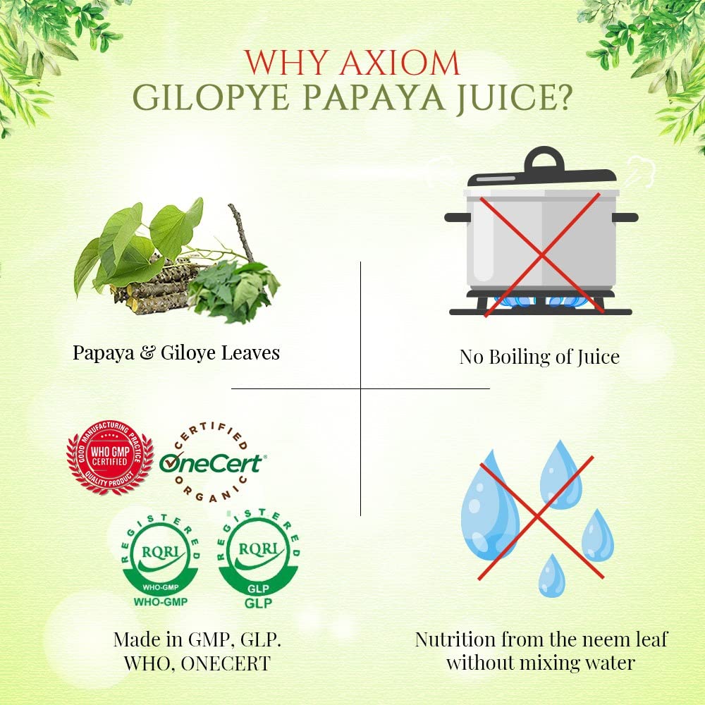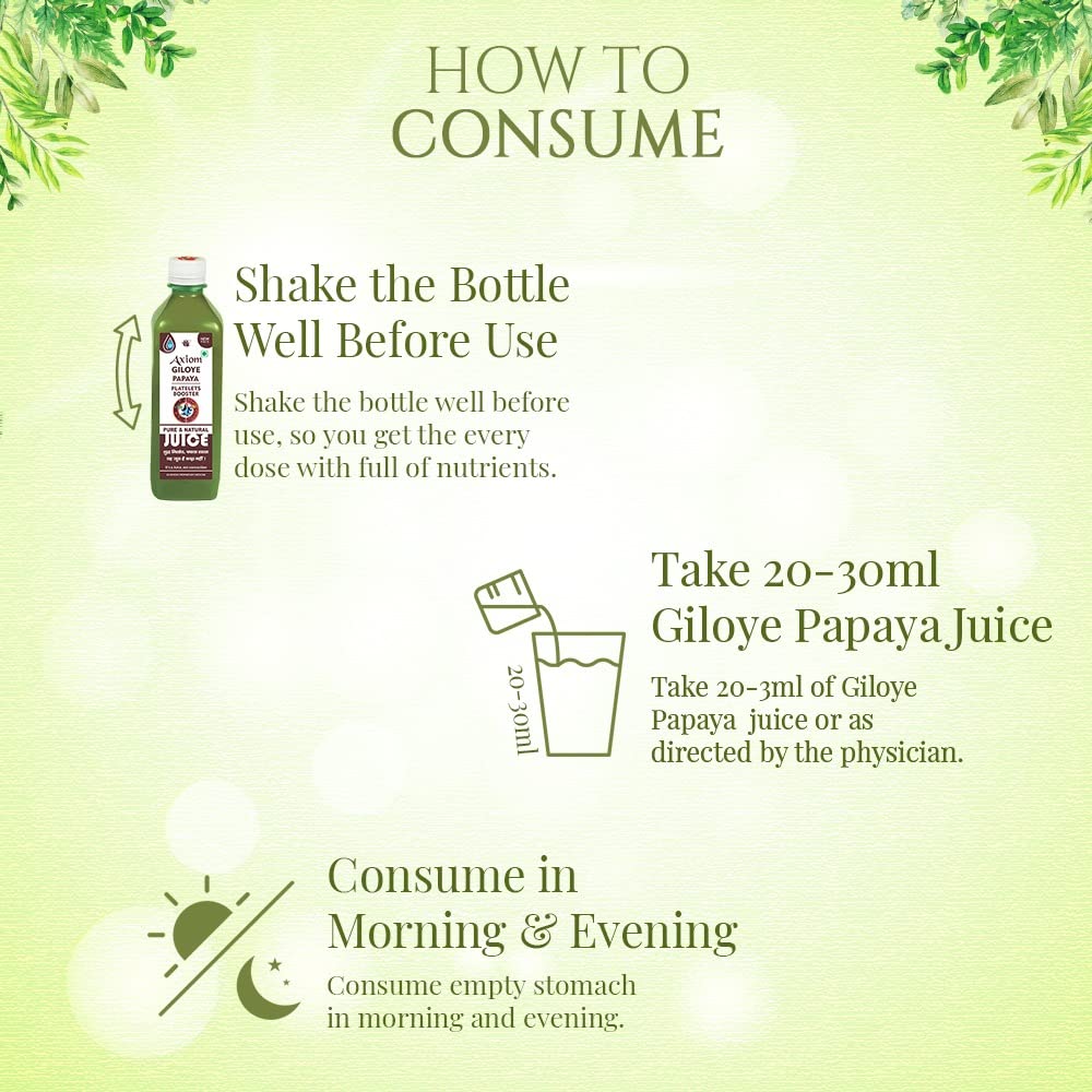 DOSAGE: Axiom Giloye Papaya Juice is 100% Natural WHO GMP GLP certified. For best possible results consume 20-30ml twice a day with lukewarm water after meals or as directed by the physician