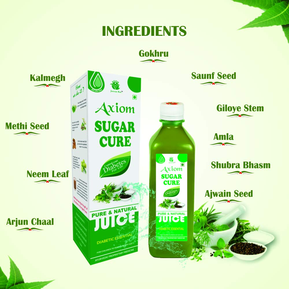 SUGAR CURE IS POWER-PACKED WITH NUTRIENTS AND HERBS. Axiom Sugar Cure Juice has Giloye Kalmegh Methi dana Shubra Bhasma Arjun chal and these have the property hypoglycemic agent.