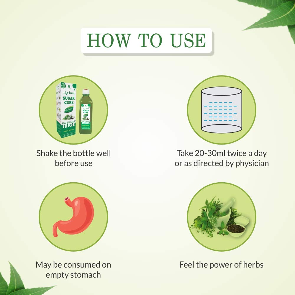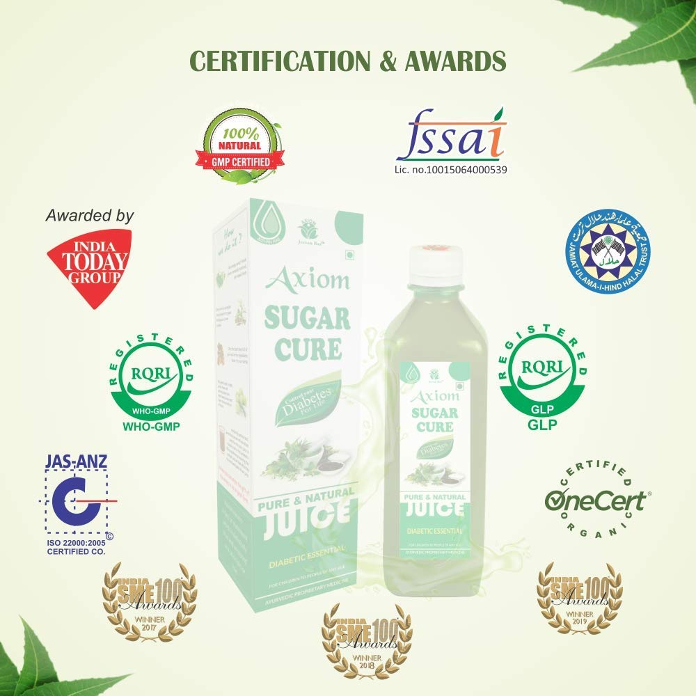 CERTIFICATION AND USES: Axiom Sugar cure Juice is 100% Natural WHO GMP GLP certified. For best results consume 20-30ml twice a day with lukewarm water after meals or as directed by the physician.