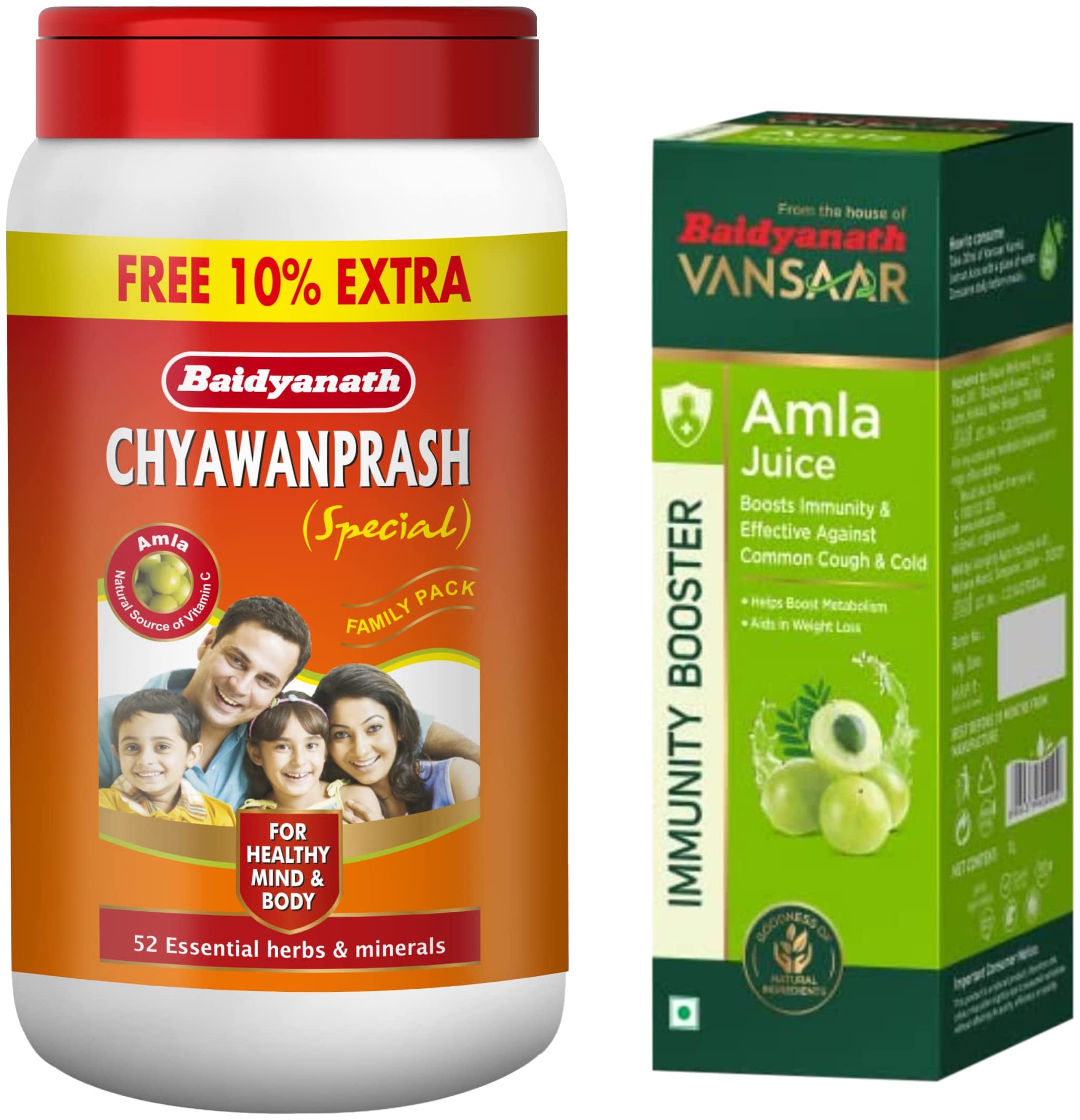 Baidyanath Amla Juice - Rich in Vitamin C and Natural Immunity Booster - 1LBaidyanath Amla Juice has been extracted from Indian Gooseberry or Amla to provide multiple health benefits for an active body and mind. It is a rich source of Vitamin C Vitamin A Iron Phosphorus Folic acid Carbohydrate and Calcium. It helps boost immunity and is effective against common infections such as cough & cold. Baidyanath Amla juice helps you achieve your weight loss goals if you maintain a strong healthy diet.Baidyanath Chyawanprash Special - All Round Immunity and Protection - 2 kg With 10% Extra FreeExtra energy active mind and increased immunity are the three major benefits of Baidyanath Chyawanprash Special. Years of establishment and potentiality of the brandâs promise has already made us stand out from the crowd. However when it comes to Chyawanprash. The day-to-day illness which is a common trouble in today's world Baidyanath Chyawanprash Special can help bolster your bodyâs immunity to fight them.