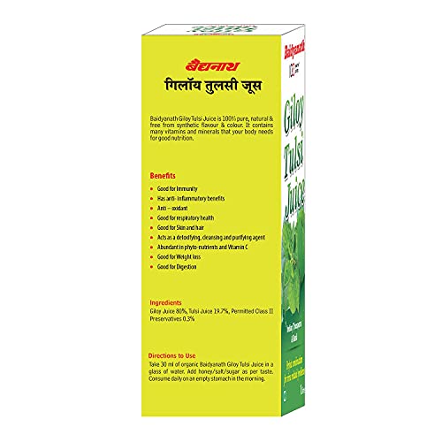 Baidyanath Giloy Tulsi Juice is extracted from fresh Tulsi leaves and Giloy stems. These two herbs individually have great health benefits and together they become more effective in boosting your immunity levels. Tulsi and Giloy are popular and useful Ayurvedic herbs. They have been used in ancient Ayurvedic medicines to combat common infections and allergies. Form - Liquid