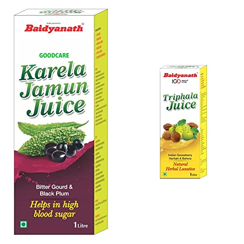 Baidyanath Karela Jamun Juice - Helps Maintain Healthy Sugar Levels - 1LBaidyanath Karela Jamun Juice is an effective natural tonic for sugar levels in the body. Karela is commonly known to maintain glucose levels while Jamun on the other hand helps in maintaining healthy pancreas. Together they also help combat indigestion dysentery and diarrhoea. Baidyanath Karela Jamun Juice is loaded with powerful antioxidants which combat free radicals in the body.Baidyanath Triphala Juice - Ayurvedic Herbal Laxative - 1LBaidyanath Triphala Juice is a powerful combination of Amla Haritaki and Bahera. Amla is rich in Vitamin C and helps strengthen the digestive system. Bahera is an ancient plant which is known to detoxify the body and helps strengthen the immune system. Haritaki is known as the âKing of Medicineâ and is regarded highly in Ayurvedic medicines. It can be used as a laxative and is beneficial against constipation. Triphala keeps Common digestive troubles like IBS hyperacidity etc. under check and helps maintain a healthy system.