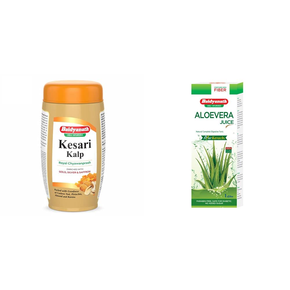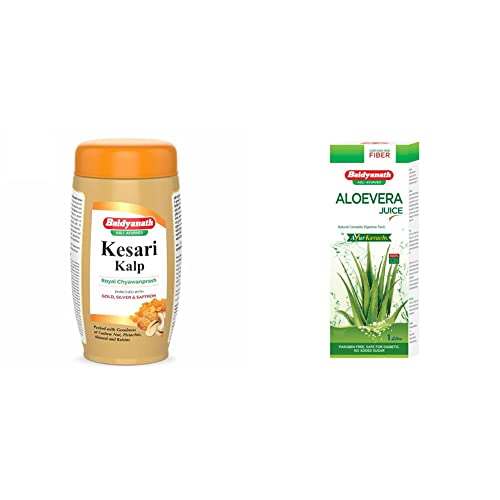 Baidyanath Kesari Kalp Royal Chyawanprash - Enriched with Gold Silver and Saffron - 1 kgAnti-ageing tonic for rejuvenation and vitality; enriched with Gold Silver and Saffron with 44 herbs and minerals. Baidyanath Kesari Shakti Kalp Chyawanprash is a unique research formula and excellent Ayurvedic tonic formulated with the combination of rare herbs rich spices and fruits by renowned Ayurvedic Scholars & Baidyanath Research Foundation. The materials are very carefully chosen to impart the right benefits that rejuvenate the body and bring back youthful energy and vigor.Baidyanath Aloe Vera juice with Pulp All Natural tonic for Immunity Better digestion and Glowing Skin 1000 mlBaidyanath Aloe Vera Juice with pulp condenses the magical benefits of this herb into a healthy herbal and wholesome drink. It boosts immunity builds a healthy digestive system and gives relief from constipation. Reduces fat and tones your body. It protects your liver. Alleviates skin allergies.Baidyanath Aloe Vera Juice is 100% pure natural & fre from any synthetic flavor & color. It contains several vitamins and minerals that your body needs for its good nutrition.