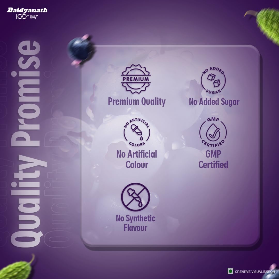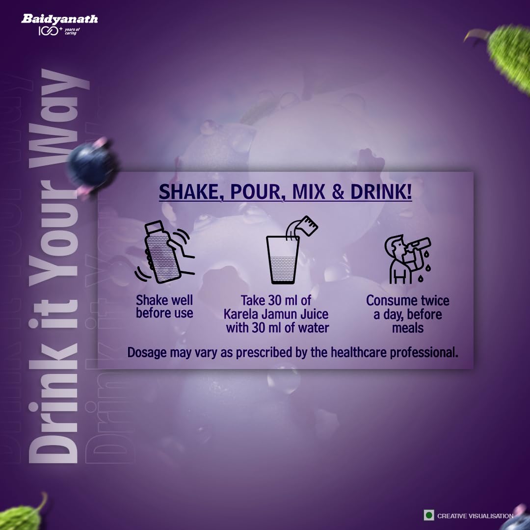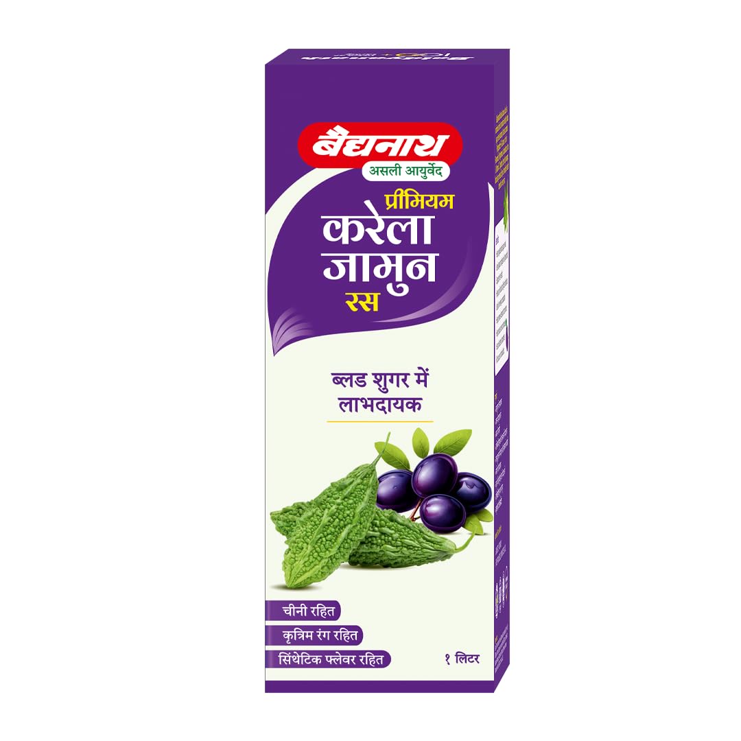 Baidyanath Premium Karela Jamun Juice is a nutritious health drink that helps maintain healthy blood sugar levels naturally. It is a pure juice with no added sugar colour or synthetic flavour. It is extracted from fresh karela & jamun retaining maximum nutrients and benefits. Karela contains Polypeptide-P & Jamun is rich in Flavonoids Polyphenols Antioxidants Iron & Vitamin C. Together they help improve sugar metabolism and are linked to effective blood sugar management. Baidyanath Karela Jamun Juice acts as a blood purifier that helps ward off infections & promotes healthy skin. It may help remove intestinal tract worms & supports the overall digestive & liver health.