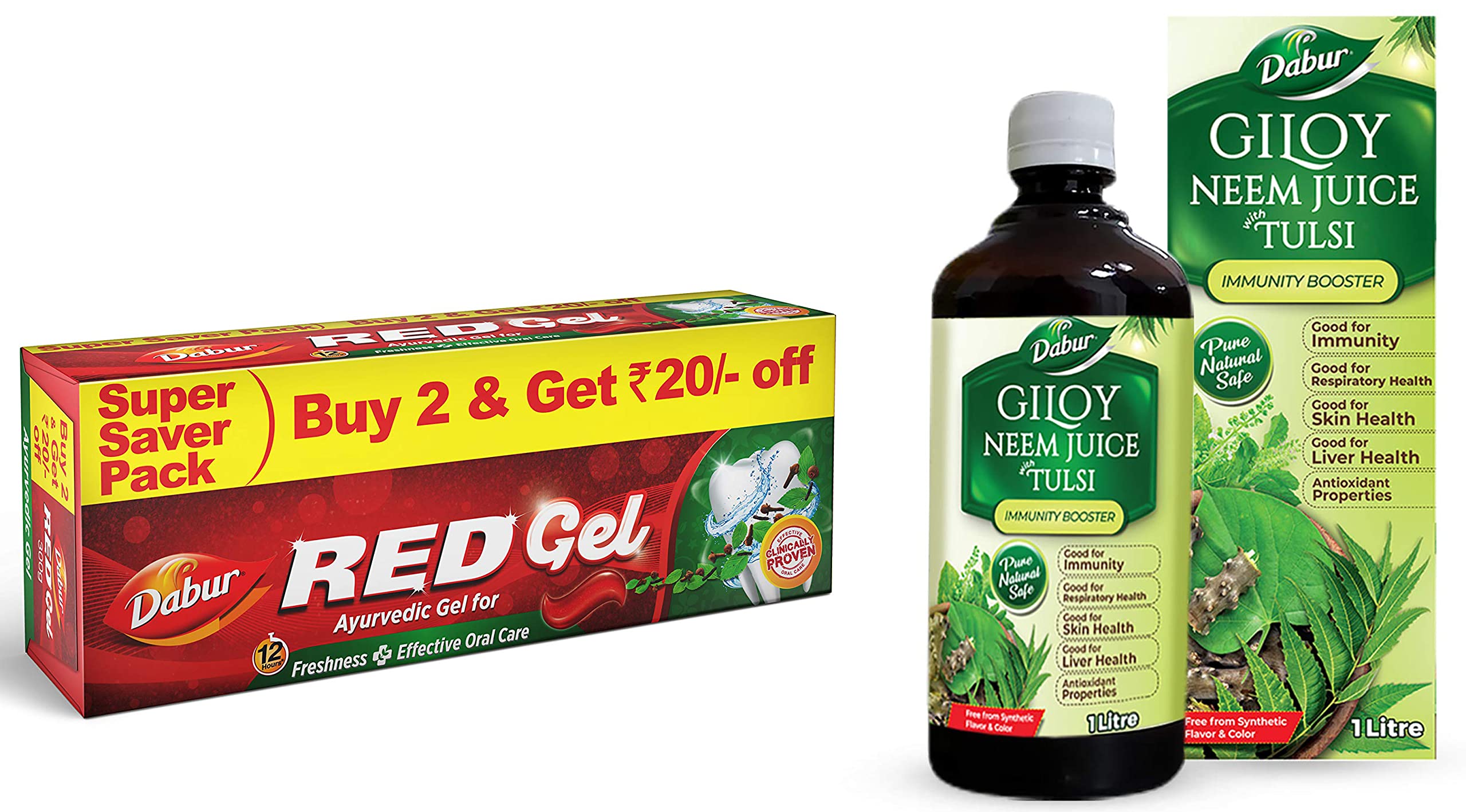 Dabur Giloy Neem Tulsi Juice: Benefit of 3-in-1 Immunity Boosters with the power of Giloy Neem and Tulsi|Pure Natural and 100% Ayurvedic Juice -1LGiloy Neem Tulsi Juice combines the goodness of three important herbs that are attributed with many beneficial effects on immunity and skin health among others . As per Ayurveda Giloy possesses Rasayana properties. Giloy is an adaptogen that helps reduce stress and fatigue which are regarded as main root cause of all lifestyle disorders. Neem is renowned for its antimicrobial properties and is good for skin health. Neem has been used traditionally in managing many skin problems like acne. It also helps in improving liver functions that helps in detoxification. Tulsi is a scared herb and has beneficial effects in many health systems. It is good for respiratory health and is a household remedy for cough and cold . Tulsi also helps boost immunity. It also has Antioxidant properties. All the three helps have protective effects on liver and support healthy liver functions. Their Antioxidant properties make them a healthy choice to boost one's health .Dabur Red Gel Controls bad breath plaque gingivitis toothache - 150 G (Pack Of 2)The 135-year-old ayurvedic company promoted by the burman family started operating in 1884 as an ayurvedic medicines company. From its humble beginnings in the bylanes of calcutta dabur india ltd has come a long way today. Overall dabur has successfully transformed itself from being a family-run business to become a professionally managed enterprise. What sets dabur apart from the crowd is its ability to change ahead of others and to always set new standards in corporate governance & innovation.