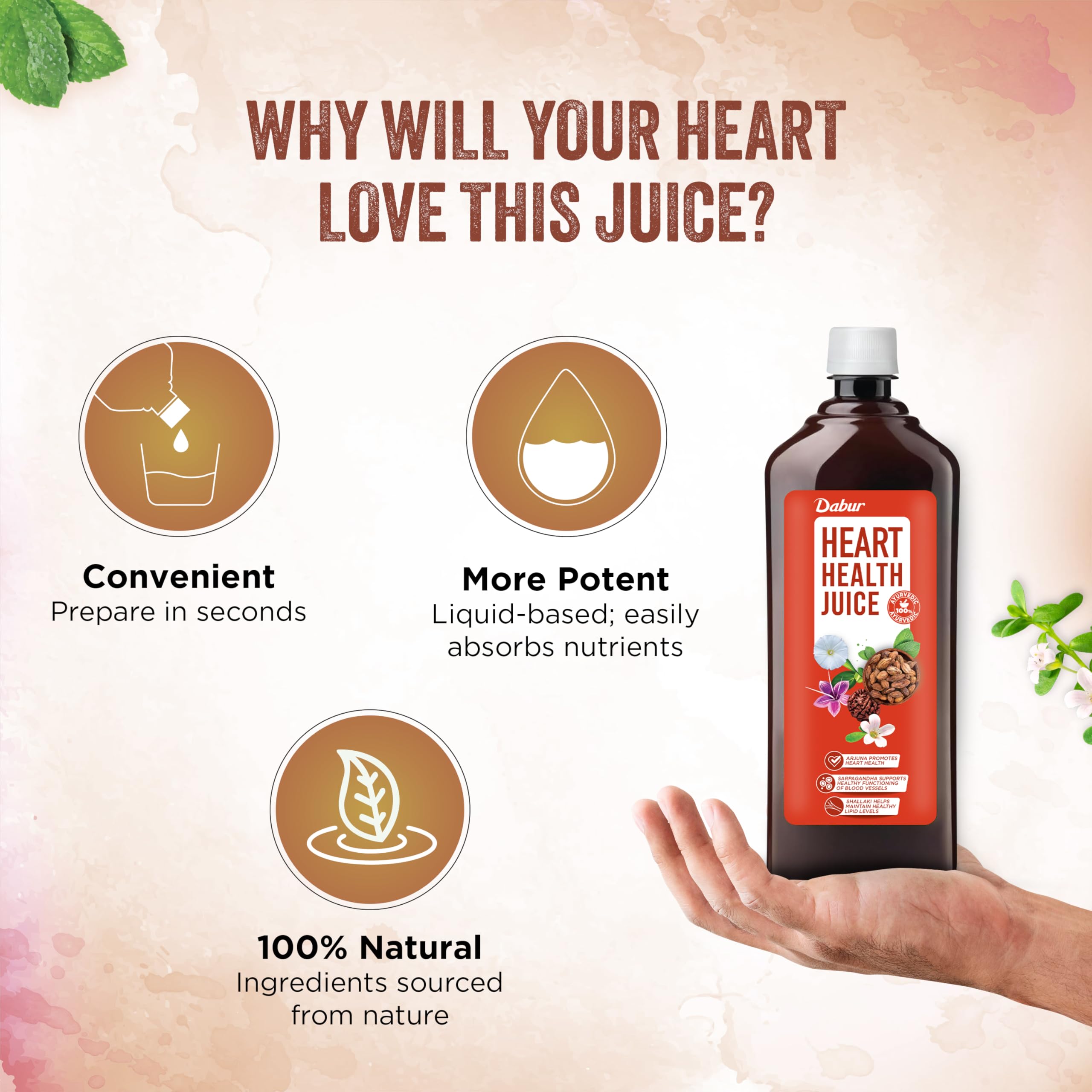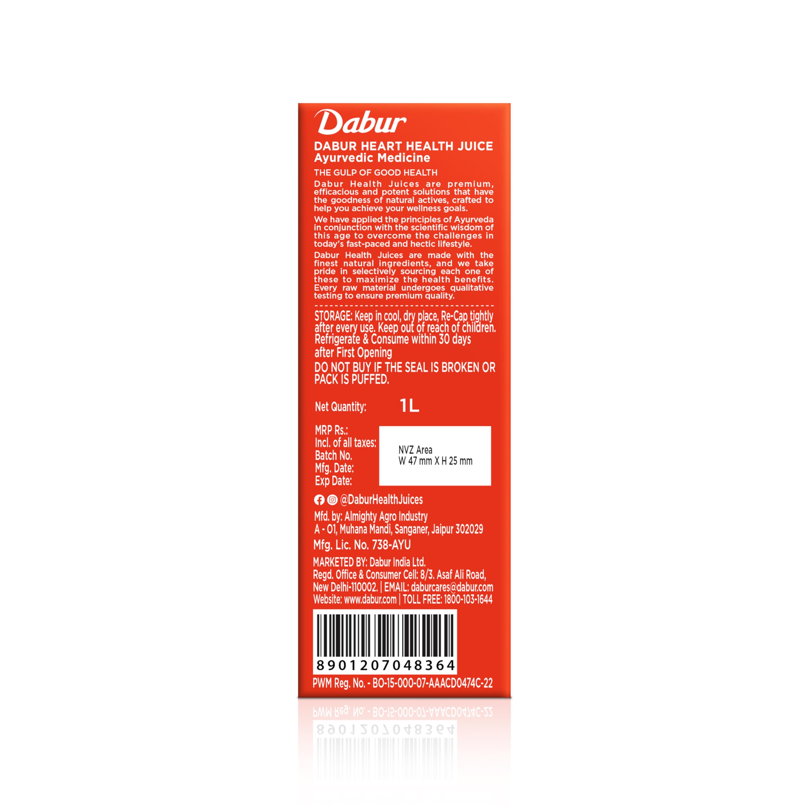 Dabur Heart Health Juice - 1L | Ayurvedic Cardiac Care Juice | Enriched with 10+ Ayurvedic Herbs | No Artificial Colors Flavours & Added Sugars