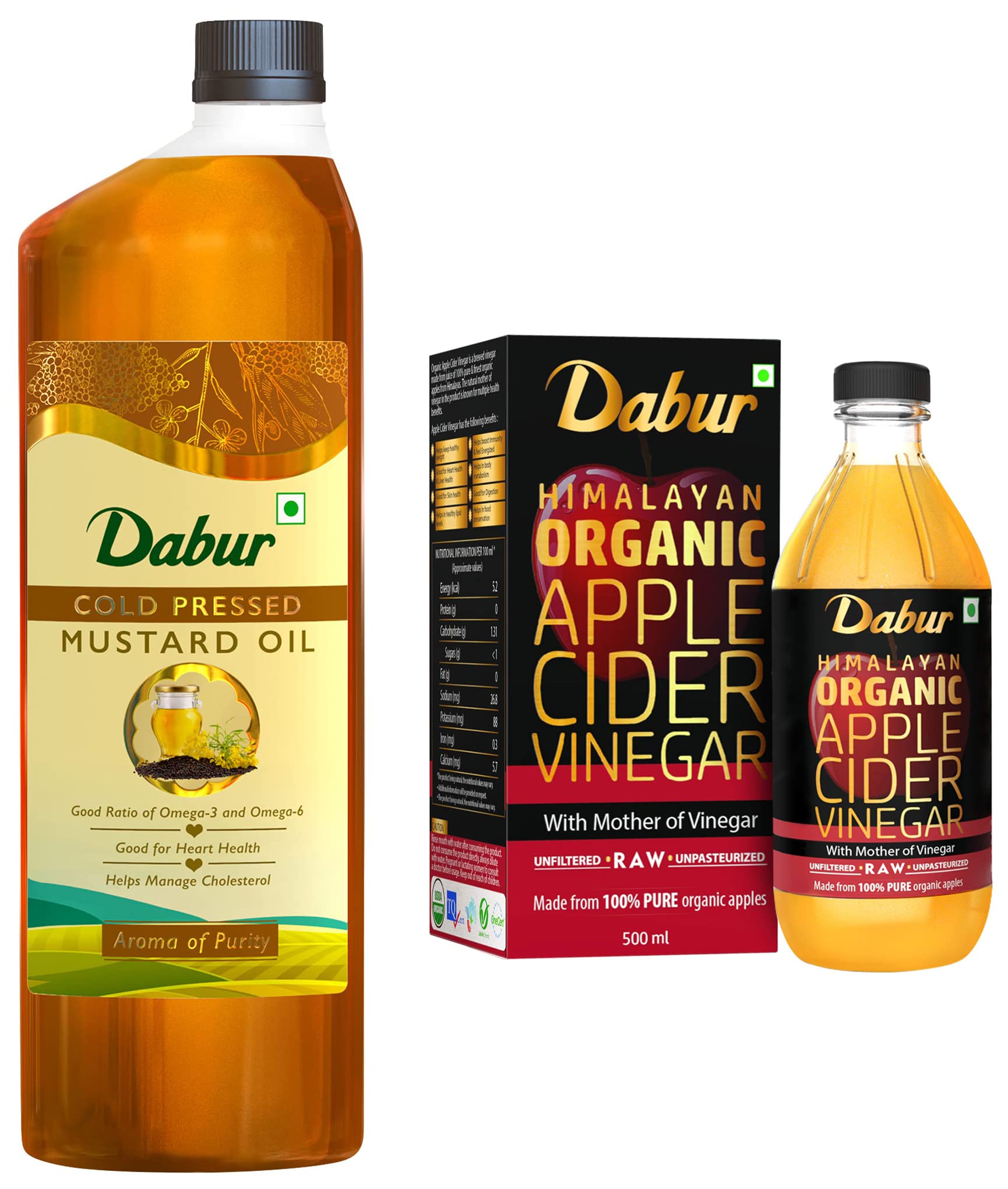 Dabur Himalayan Organic Apple Cider Vinegar with Mother of Vinegar |100% Pure | USDA Organic Certified | Raw Unfiltered and Unpasteurized | Good for Heart and Liver Health | No added colours or preservatives - 500 mlDabur Himalayan Organic Apple Cider Vinegar is Organic unfiltered undiluted & unpasteurized Apple Cider Vinegar with genuine mother of Vinegar content. It is made by fermenting the real apple juice extracted from 100% pure & finest organic apples from Himalayas in order to obtain maximum health & wellness benefits. It is naturally rich in antioxidants and has numerous uses as a health & wellness aid. You may consume Organic Apple Cider vinegar in morning with warm water or add it to your salad green tea & juices. It helps keep healthy weight healthy lipid levels increase body's metabolism & is good for Heart Liver & Skin Health as well. It is USDA ORGANIC certified & is safe to use.Dabur Cold Pressed Mustard Oil 1L | Healthy Cooking Oil | Goodness of Omega 3 & 6 | Perfect blend of Health Taste & AromaIt is traditionally cold pressed from finest quality mustard seeds ensuring that the natural properties and health benefits are intact. It contains the good ratio of omega -3 and omega - 6 fatty acid. Daily consumption of DABUR cold pressed mustard oil gives way to healthy lifestyle.It is rich in monosaturated fatty acid making it good for heart and it also helps in managing cholesterol and improve blood circulation. Cooking with DABUR mustard oil gives a delicious twist to your dish with great flavour and aroma.