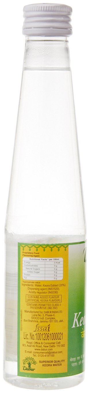 Dabur Keora Water is a high quality extract of the pandanus plant. Also known as kewra or kewda water it's most popular used as a flavouring agent.It boasts a lovely fragrance similar to rose water and is best used to prepare desserts aromatic rice barbecue and non-vegetarian dishes.