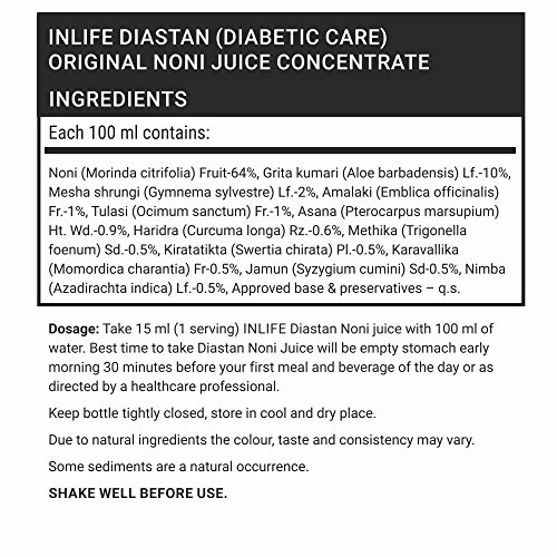 • MAJOR BENEFITS: Supports normal sugar levels helps reduce carbohydrate and sugar absorption and promotes heart health. Better results come together by combining INLIFE Diastan Noni juice with a healthy diet and exercise.