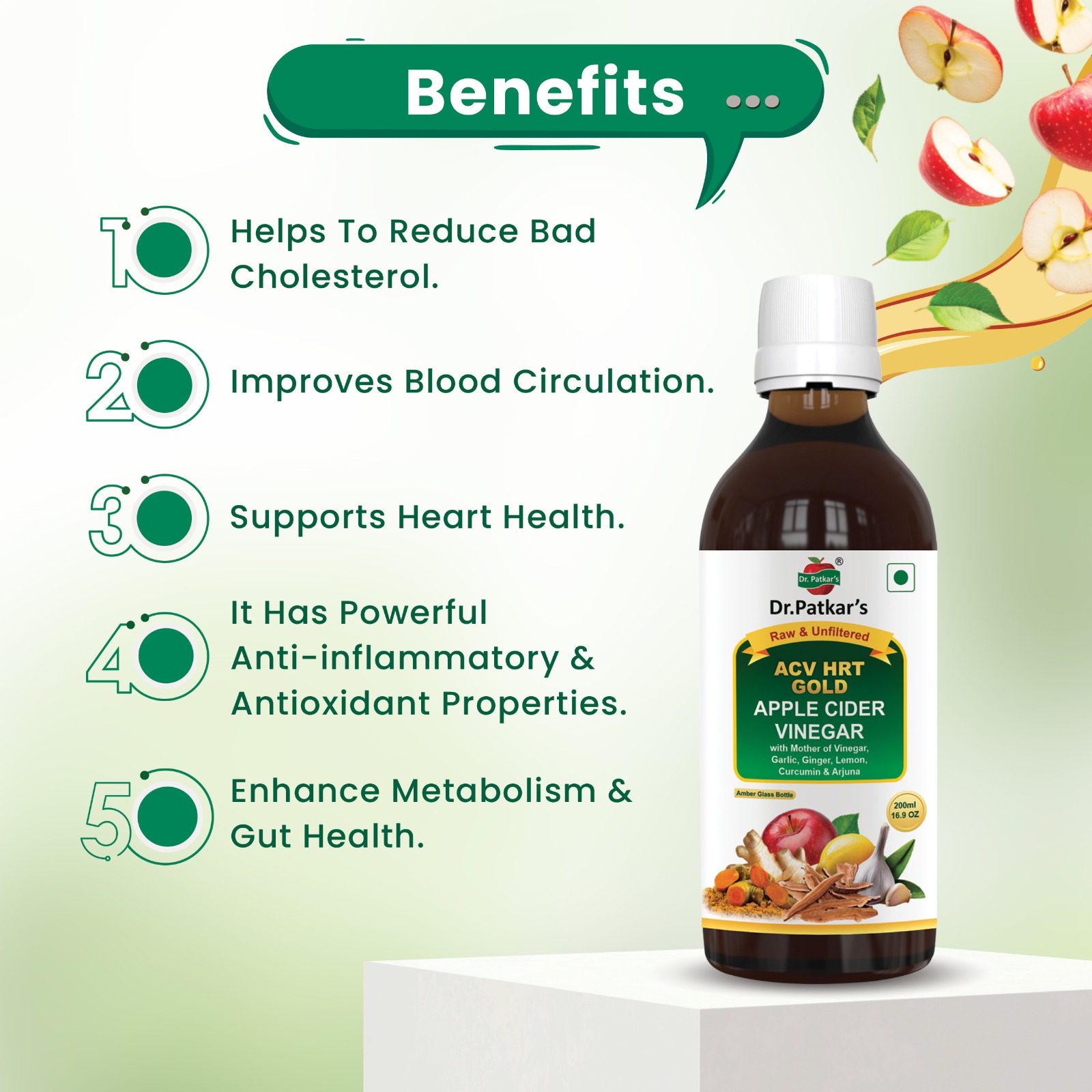 Dr. Patkar's ACV HRT GOLD | Apple Cider Vinegar with Arjuna, Curcumin, Ginger, Garlic & Lemon | 2X Formula Health Shot | Immunity, Heart & Gut Support | Raw & Unfiltered (200 ML)
