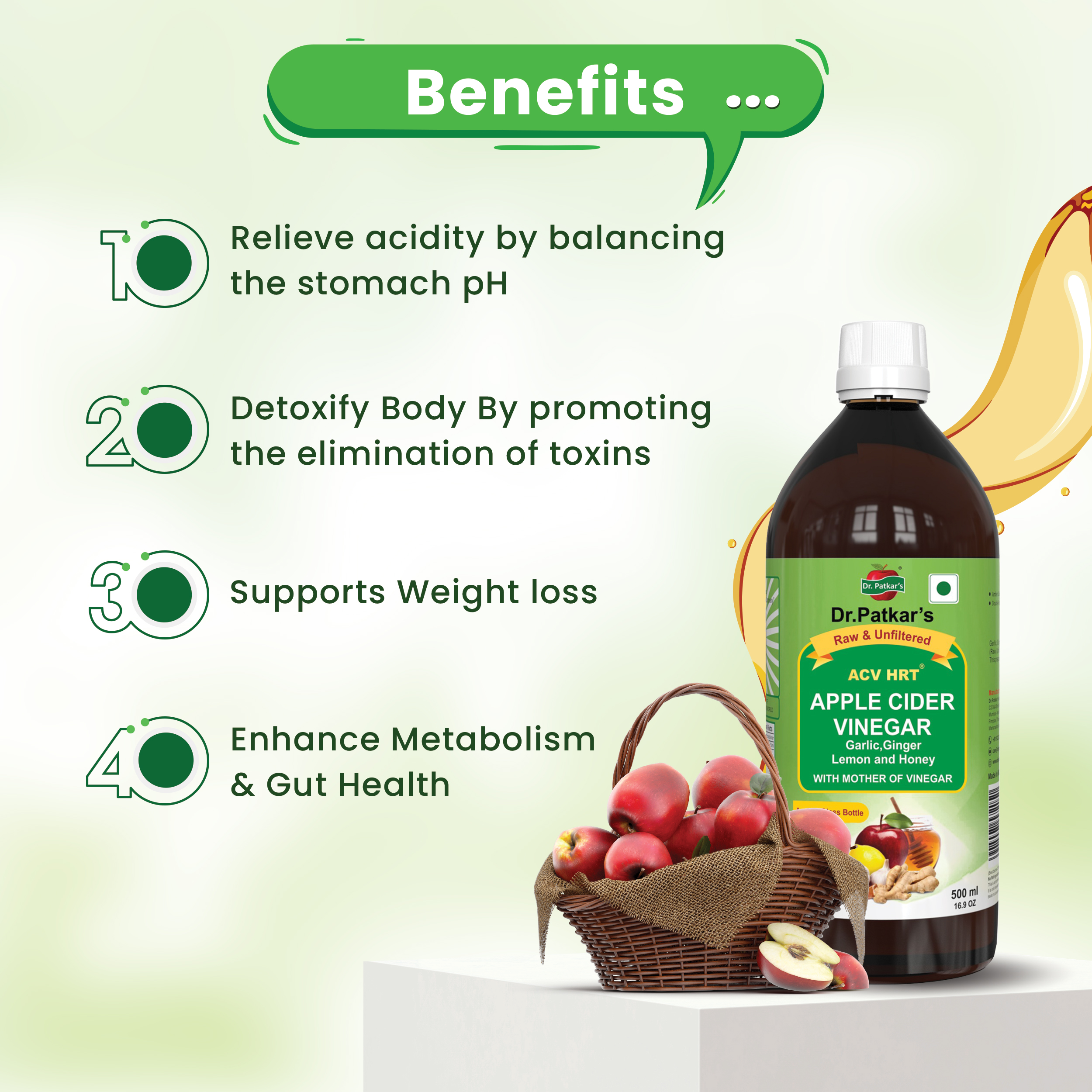 3-in-1 Digestion Support: Dr. Patkar's Apple Cider Vinegar with Ginger, Garlic, Lemon, and Honey is a great health supplement for good digestive health as it supports detoxification, helps manage bloating, and promotes healthier digestion. This, in turn,