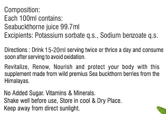 • Premium Quality: Everyouth Seabuckthorn Juice is crafted with care and precision, using only the finest Seabuckthorn berries sourced from the pristine Himalayan region.