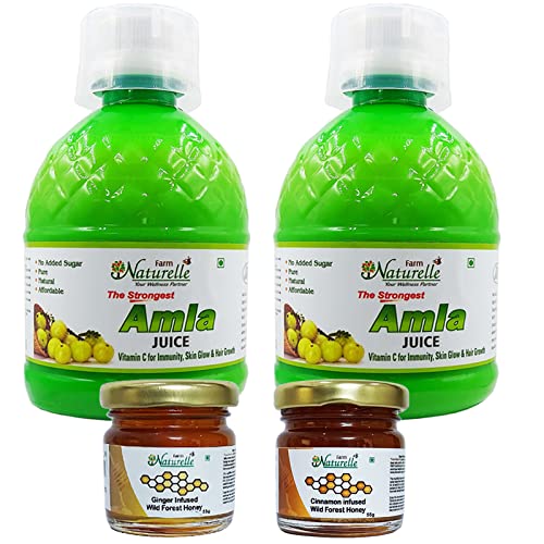 Farm Naturelle-Strongest n Concentrated Amla Juice | Improves Skin Health & Hair Growth | Rich in Vitamin C and Good immunity booster | Amla Juice -2x400ml+ 55gx2 Herbs Infused Forest Honeys
