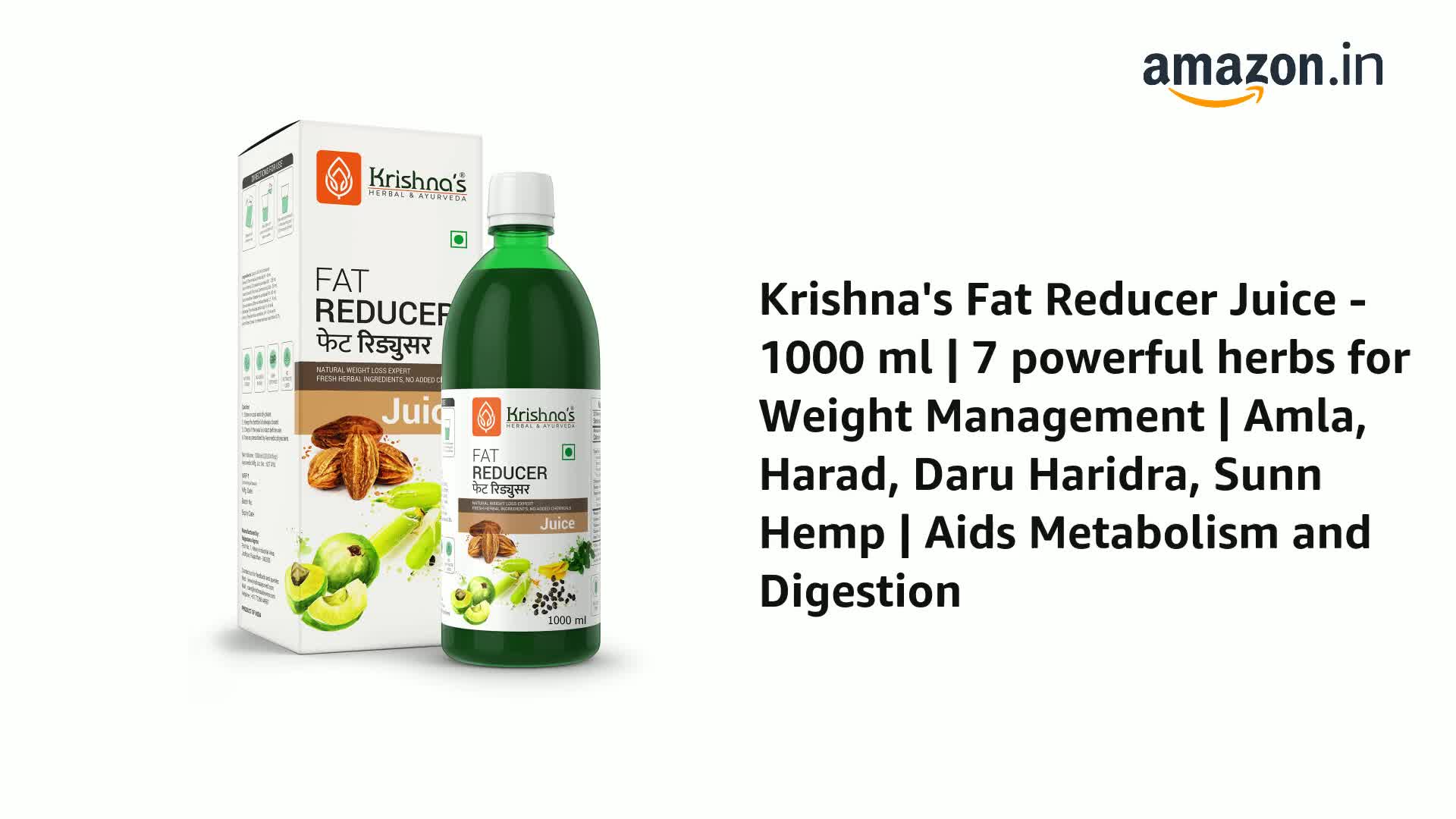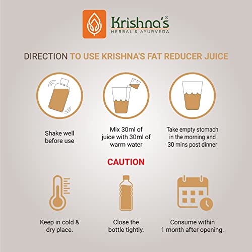 Krishna's fat reducer juice is beneficial in burning excess fat and thereby reducing weight. It also strengthens digestive system liver by purifying the blood. Key ingredients: harad - 8 percent san beej - 25 percent arand moot - 25 percent daru haridra - 20 percent stevia leaves - 5. 7 percent baheda - -8 percent amla - 8 percent permitted class ii preservatives: 0. 3 percent.