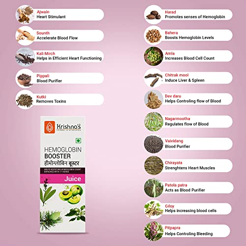 Krishna's hemoglobin booster juice is beneficial in increasing blood count and curing anemia. Key ingredients: harad 6. 66 percent haheda 6. 66 percent amla chitrak mool 6. 66 percent devdaru 6. 66 percent dam haldi 6. 66 percent motha 6. 66 percent vidang 6. 66 percent chirayta 6. 66 percent patol patra 6. 66 percent giloy 6. 66 percent pitpapda 6. 66 percent ajwain 6. 66 percent sonth 3. 33 percent kali mirch 3. 33 Pippl 10. 09 Kutki 3. 33 With permitted class ii preservative.