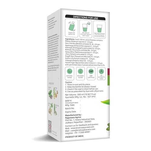 Krishna's liver relive juice contains different vital herbs in optimum concentration required to provide complete benefits for restore liver function parameters which may help to check degeneration and promote regeneration of liver cells. It may have antiviral antioxidant anti-inflammatory and immune- modulator action. Beneficial in all kinds of liver problems. Key ingredients: mukoy 9 percent darn haridra 9 percent apamarg 9 percent kalmegh 9 percent rohitak 9 percent sarpankha 9 percent jhau 9 percent dugdh feeni 8 percent kasni 8 percent vidang 8 percent krasrigar 13 percent with permitted class ii preservatives.