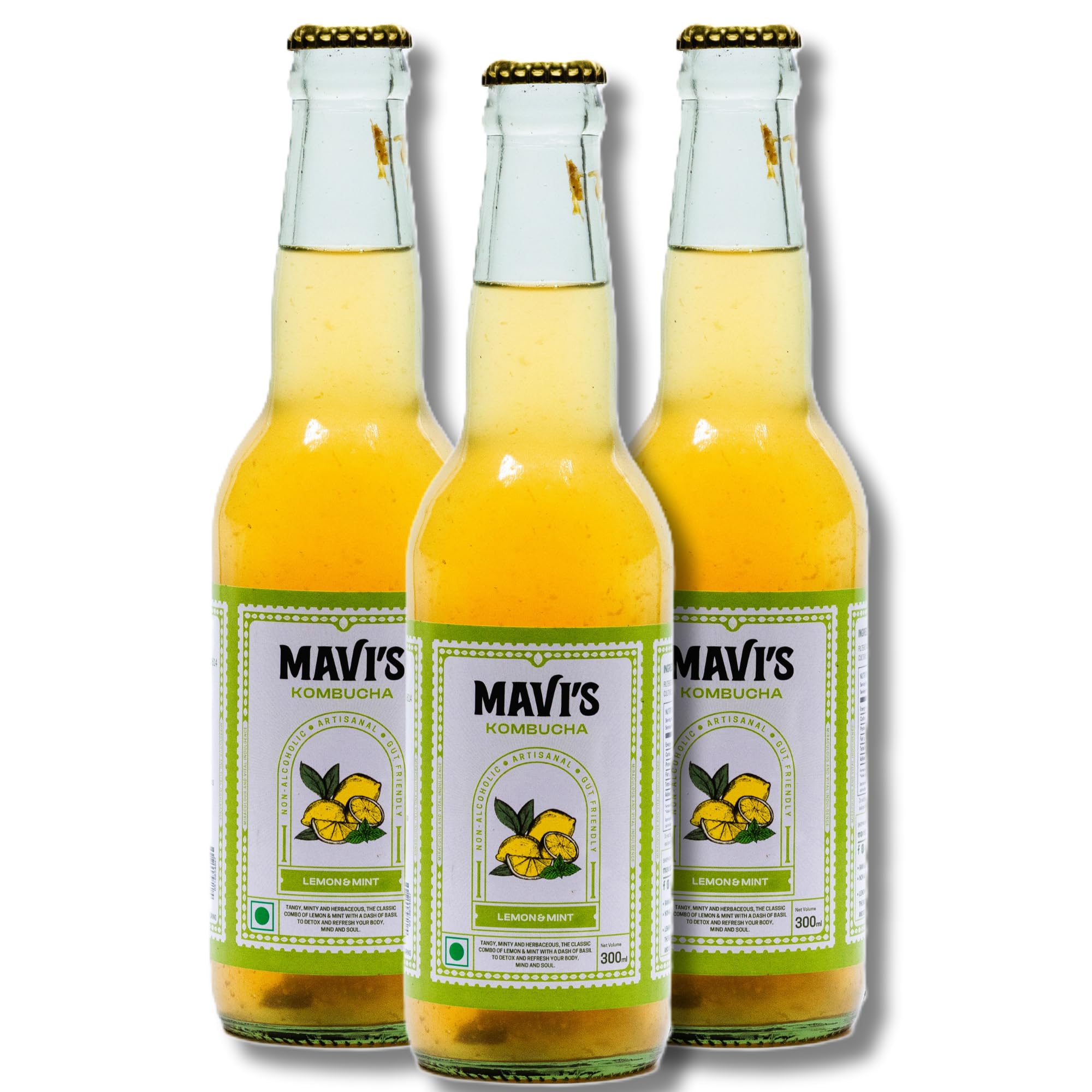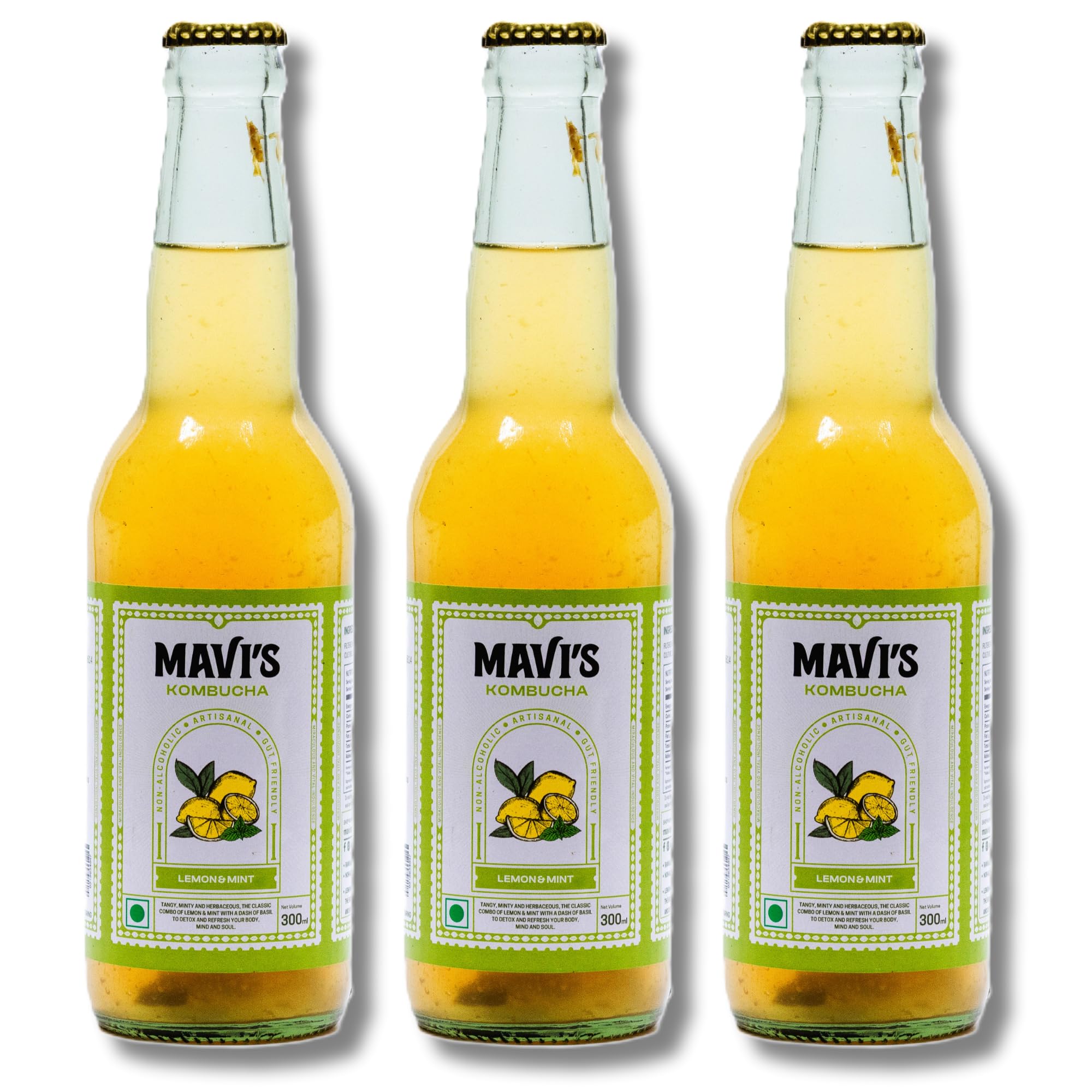 MAVI's Lemon Mint & Basil Kombucha | Real Citrusy Lemon & Organic Basil Leaves | 100% Natural & Organic | No Preservatives No Artificial Flavour or Colour | Gut Friendly | 300ml Each (Pack of 3)