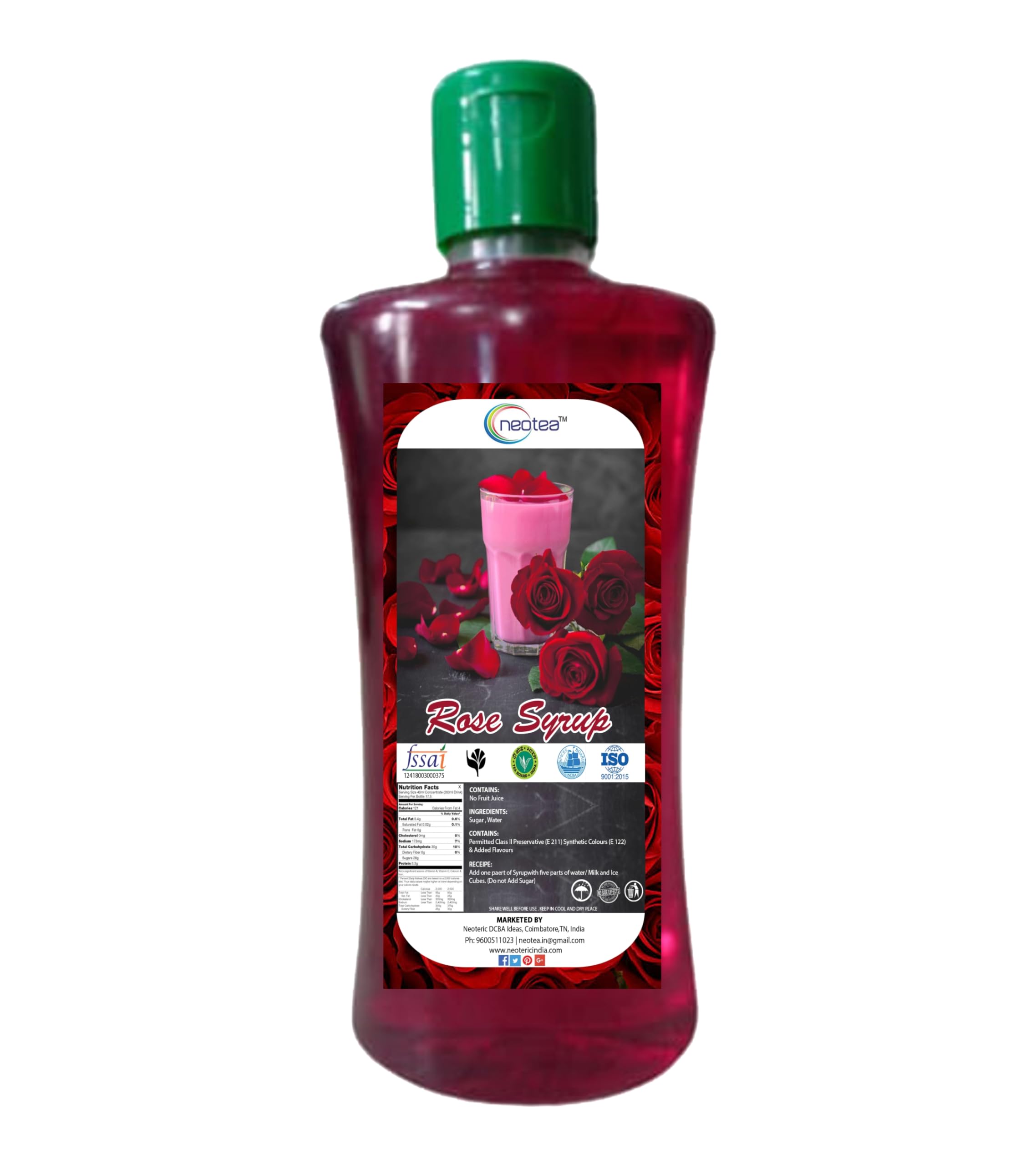 Neotea Rose Syrup (250ml) is a premium natural syrup crafted to add a delicate floral flavor to your favorite drinks and desserts. Made from real rose essence this syrup offers a refreshing and aromatic taste perfect for enhancing cocktails mocktails juices smoothies and even desserts. Versatile & Flavorful: Neotea Rose Syrup is ideal for adding a unique floral touch to a wide range of beverages. Whether you're mixing up cocktails refreshing mocktails or simply sweetening your juices and smoothies this syrup provides a perfect balance of sweetness and floral essence. Itâs also great for flavoring desserts like cakes ice creams and pastries. Natural Ingredients: Enjoy the purity of Neotea Rose Syrup made without any artificial colors preservatives or additives. Each bottle is packed with the natural aromatic taste of real rose offering a wholesome and authentic flavor experience. Perfect for Any Occasion: Whether youâre hosting a party enjoying a relaxing evening at home or experimenting with new recipes Neotea Rose Syrup is your go-to ingredient for adding a refreshing and aromatic touch to every sip and bite. Key Features: Natural Floral Flavor: Made with real rose essence for a true aromatic floral taste. No Artificial Additives: Free from artificial colors preservatives and chemicals for a pure and natural flavor. Versatile: Perfect for flavoring cocktails mocktails juices smoothies desserts and more. Refreshing & Aromatic: A delicate and refreshing taste that enhances the overall drinking and eating experience. Convenient 250ml Bottle: Perfect size for everyday use or for hosting gatherings and parties.